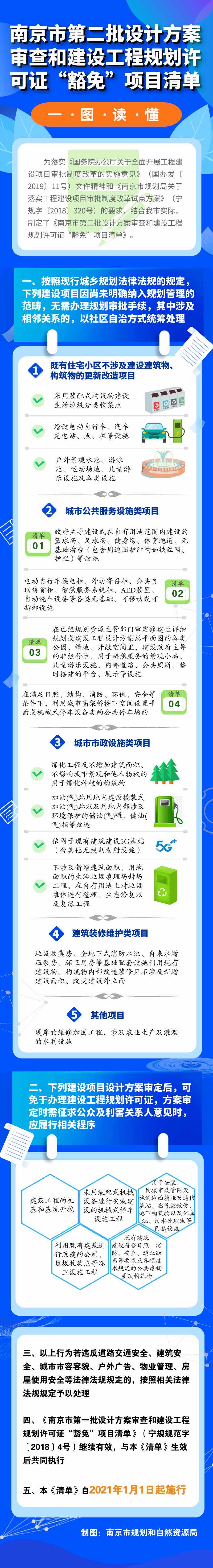 为落实《国务院办公厅关于全面开展工程建设项目审批制度改革的实施意见》(国办发〔2019〕11号)文件精神和《南京市规划局关于落实工程建设项目审批制度改革试点方案》(宁规字〔2018〕320号)的要求,结合我市实际,制定了《南京市第二批设计方案审查和建设工程规划许可证“豁免”项目清单》(以下简称《清单》),现予以印发,请遵照执行。