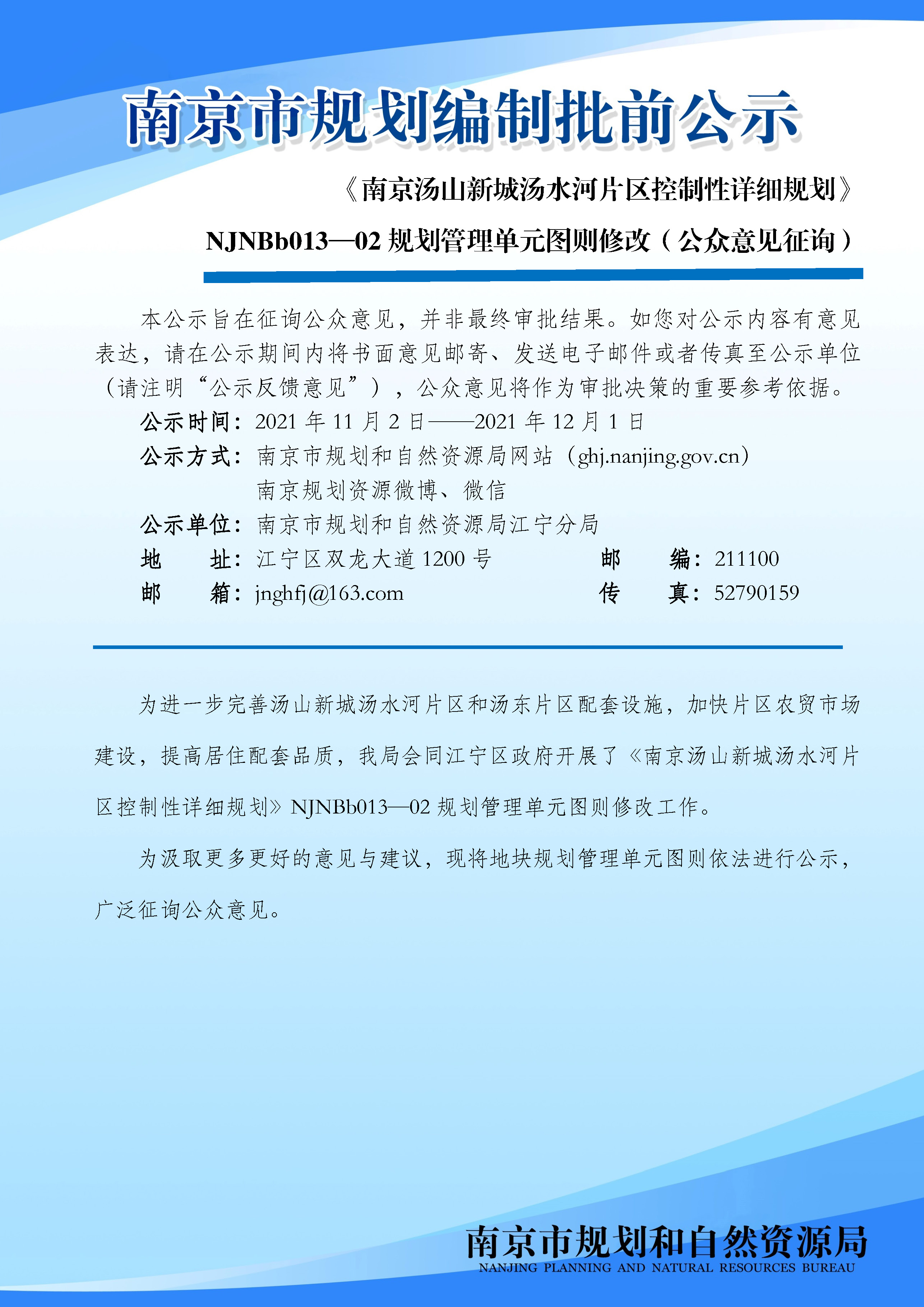 《南京汤山新城汤水河片区控制性详细规划》NJNBb013—02 规划管理单元图则修改(公众意见征询)