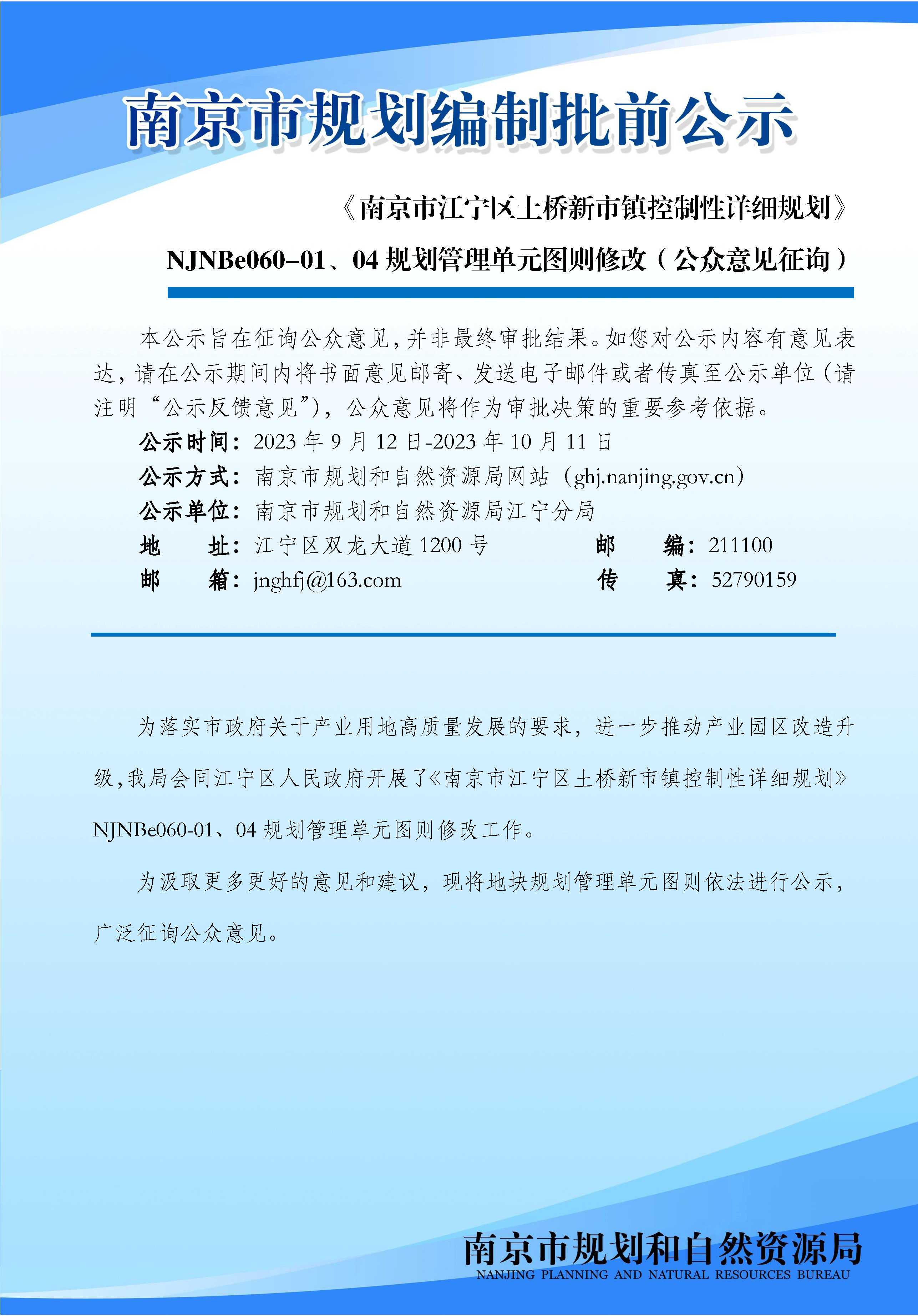 《南京市江宁区土桥新市镇控制性详细规划》NJNBe060-01、04规划管理单元图则修改(公众意见征询)