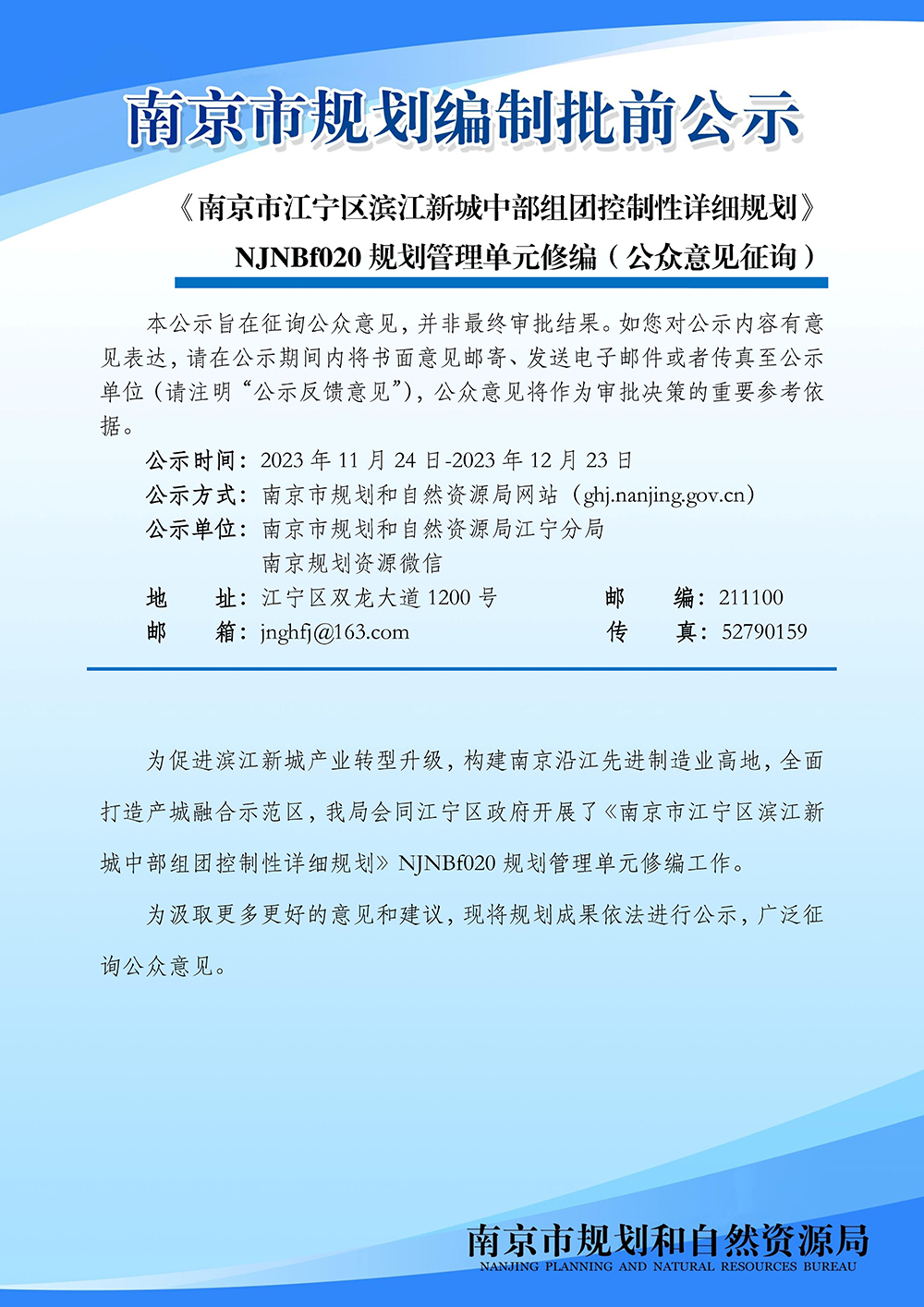《南京市江宁区滨江新城中部组团控制性详细规划》NJNBf020规划管理单元修编(公众意见征询)