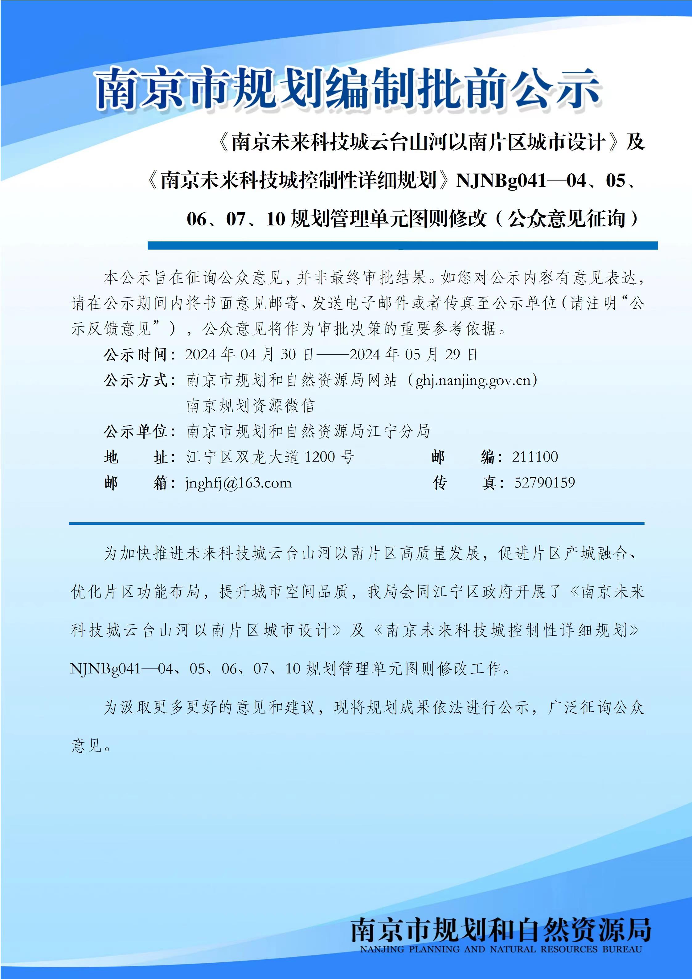 《南京未来科技城云台山河以南片区城市设计》及《南京未来科技城控制性详细规划》NJNBg041—04、05、06、07、10规划管理单元图则修改(公众意见征询)
