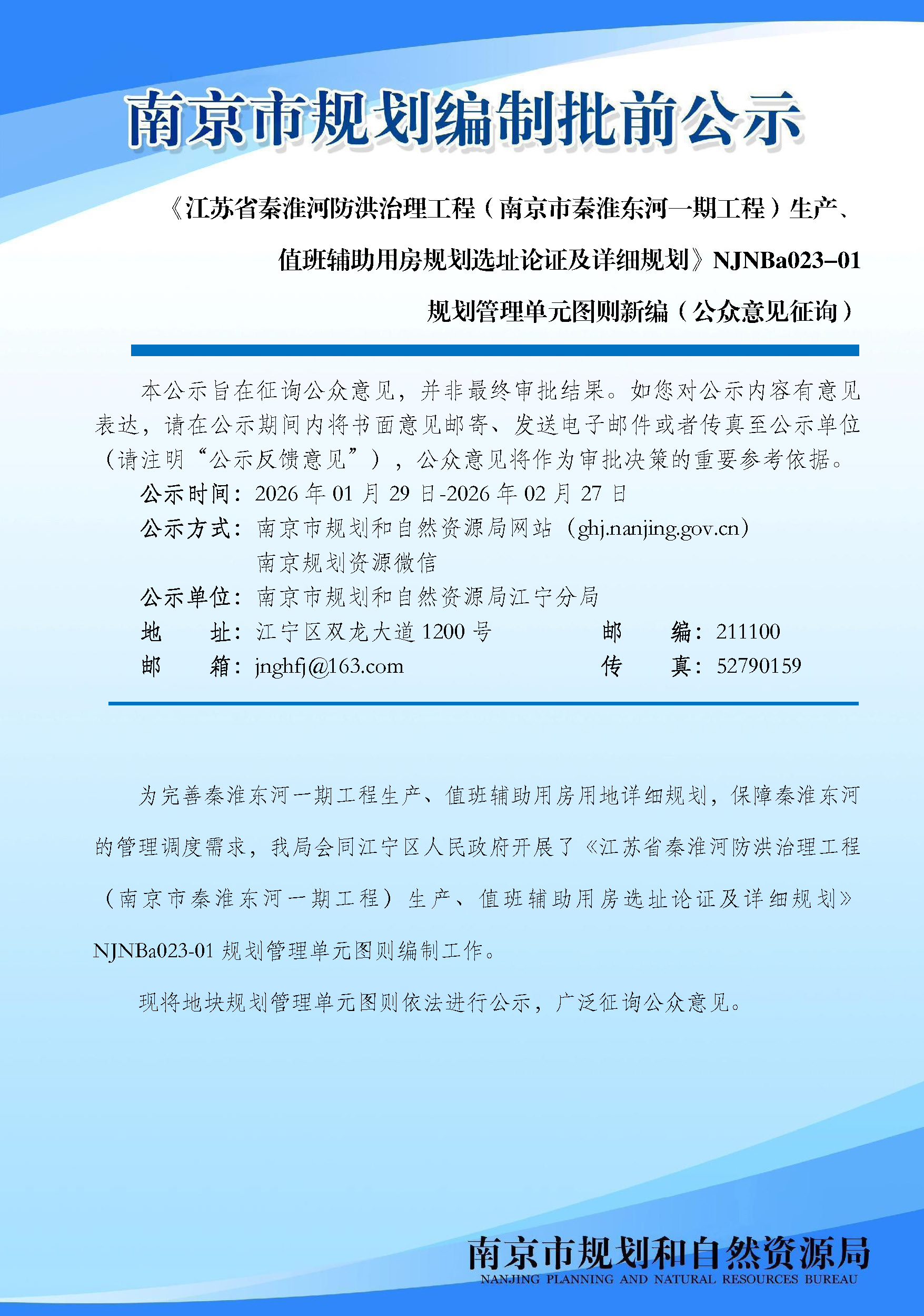 《江苏省秦淮河防洪治理工程(南京市秦淮东河一期工程)生产、值班辅助用房规划选址论证及详细规划》NJNBa023-01规划管理单元图则新编(公众意见征询)