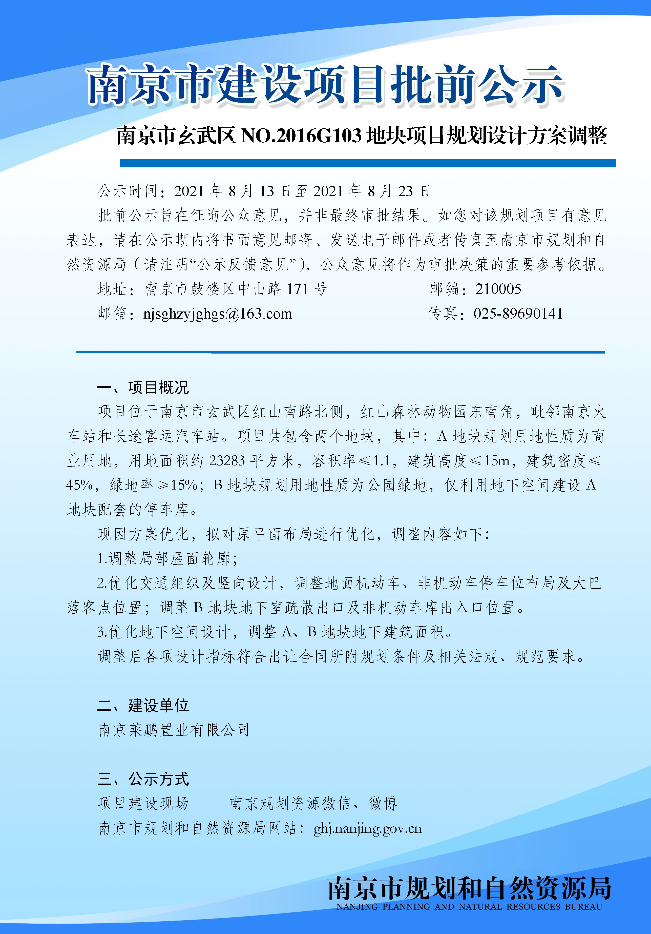 南京市玄武区NO.2016G103地块项目规划设计方案调整批前公示