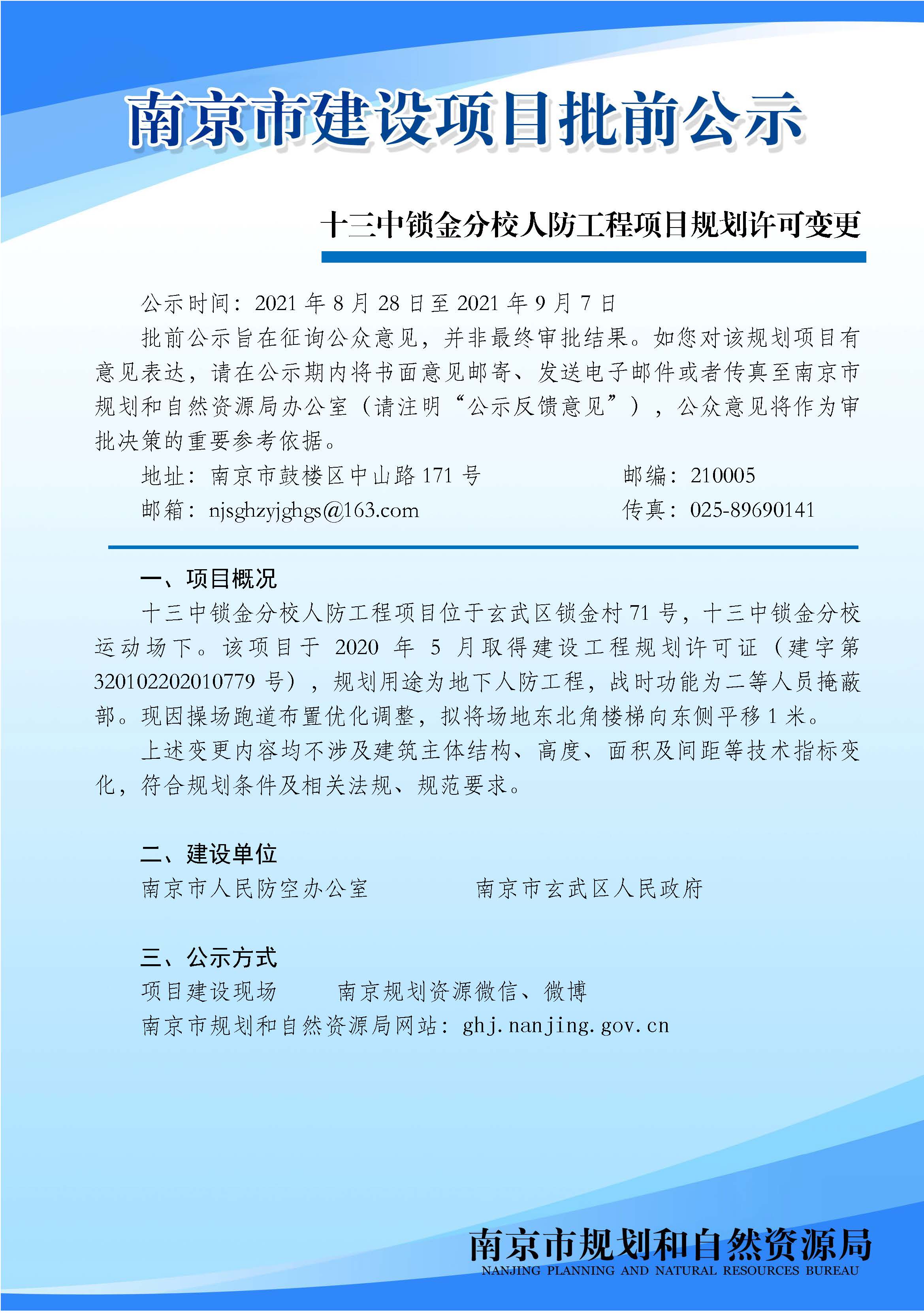 十三中学锁金村分校人防工程(地下停车场)规划许可变更批前公示