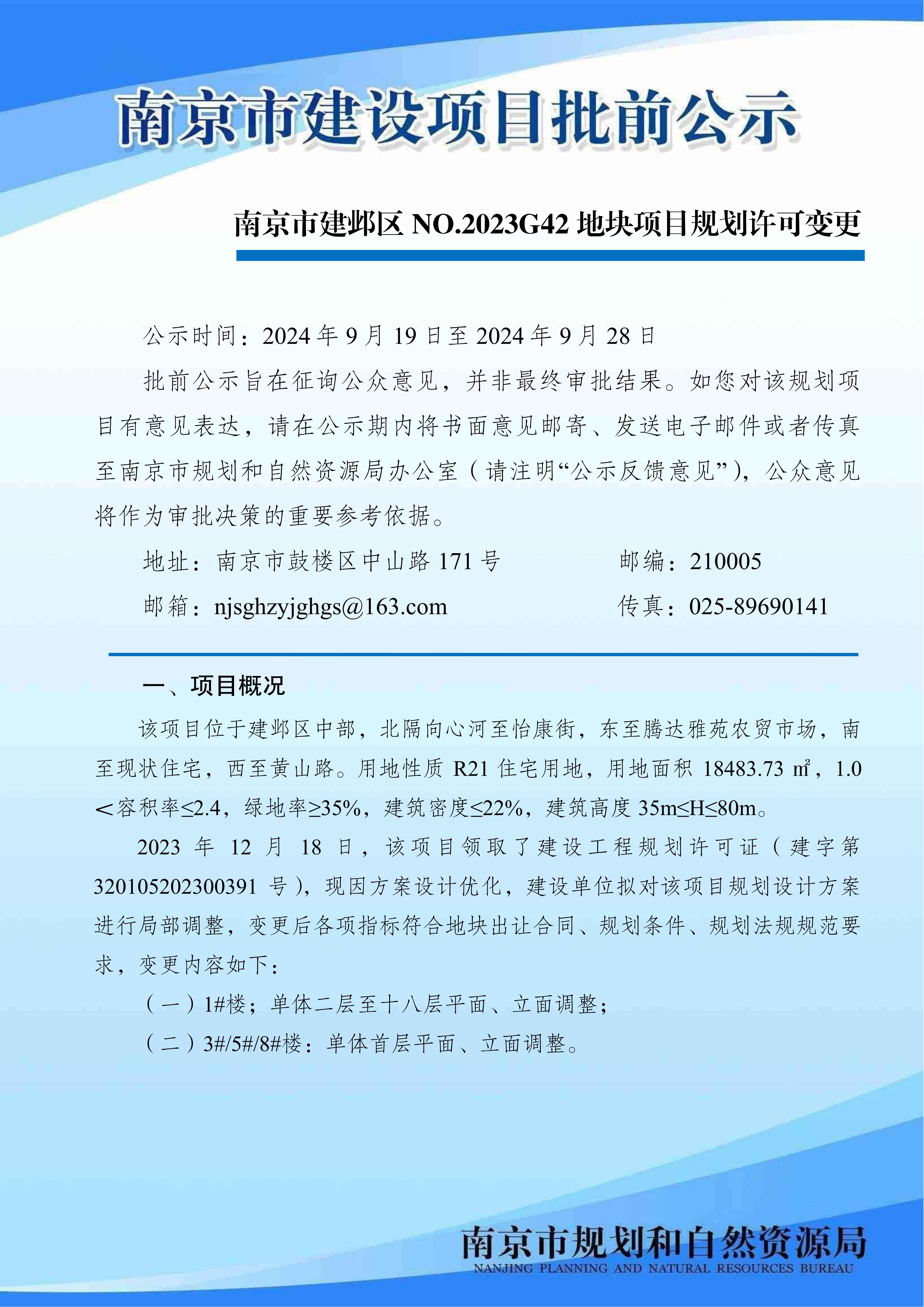 南京市建邺区NO.2023G42地块项目规划许可变更批前公示