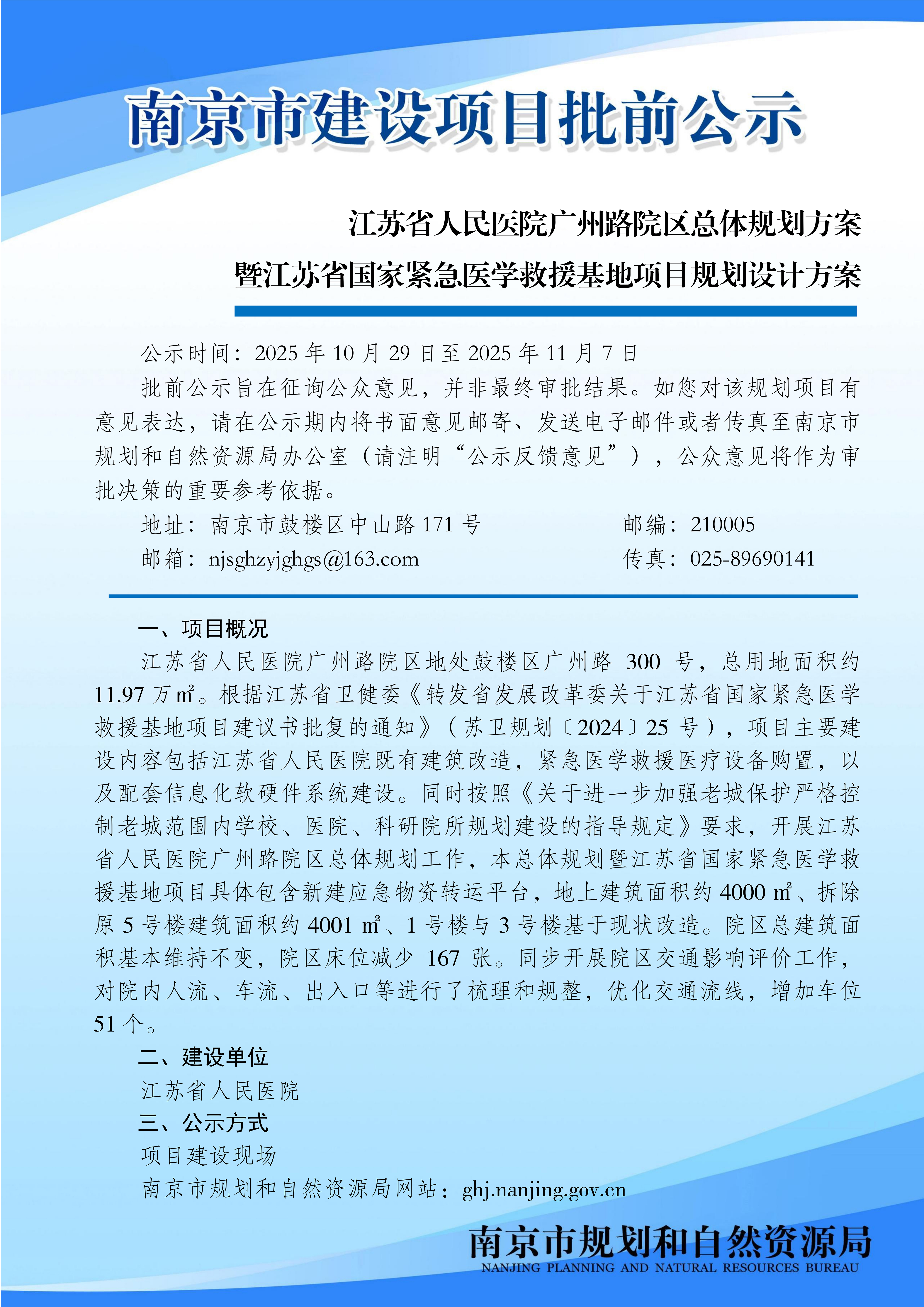 江苏省人民医院广州路院区总体规划方案暨江苏省国家紧急医学救援基地项目规划设计方案批前公示