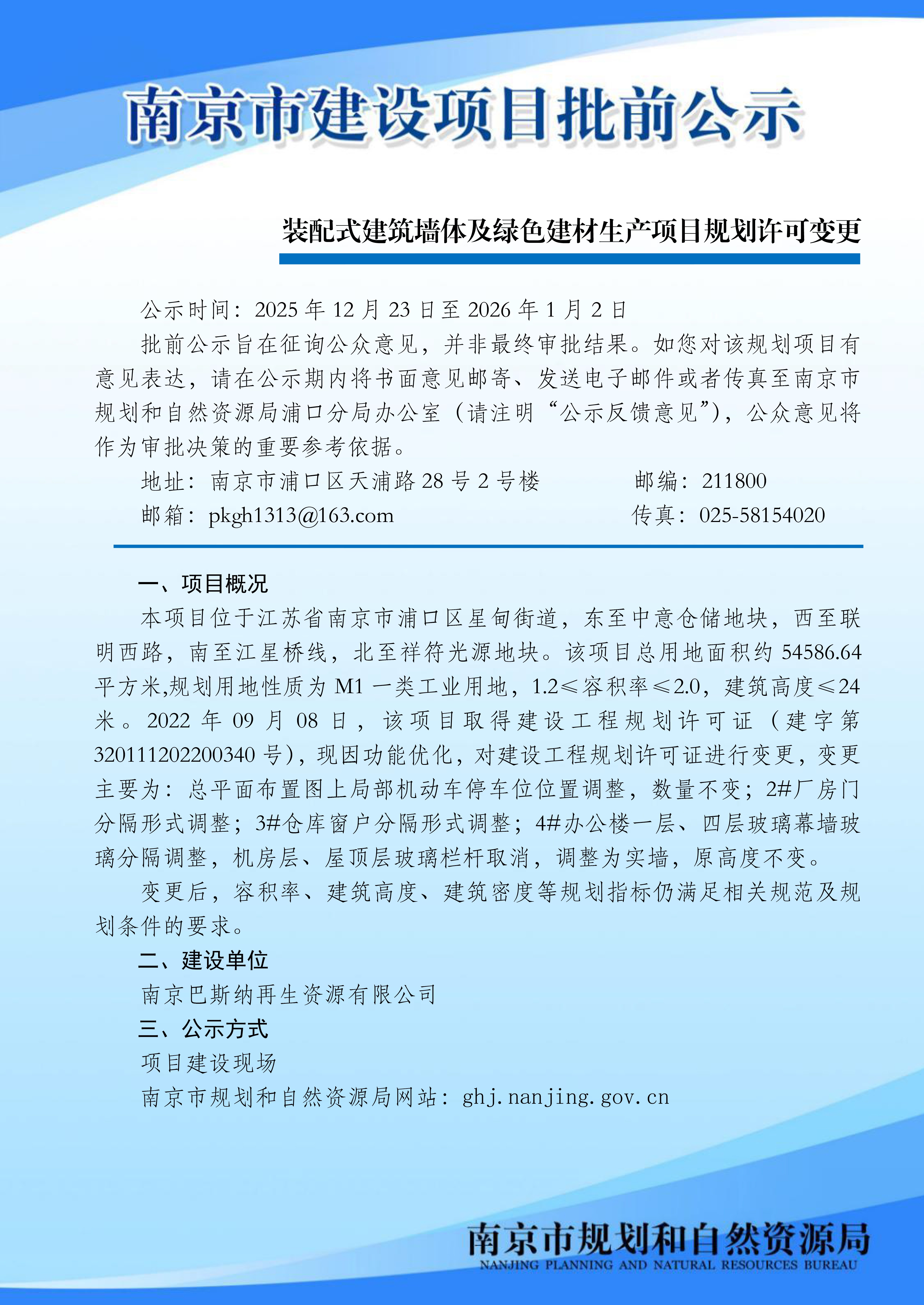 装配式建筑墙体及绿色建材生产项目规划许可变更批前公示