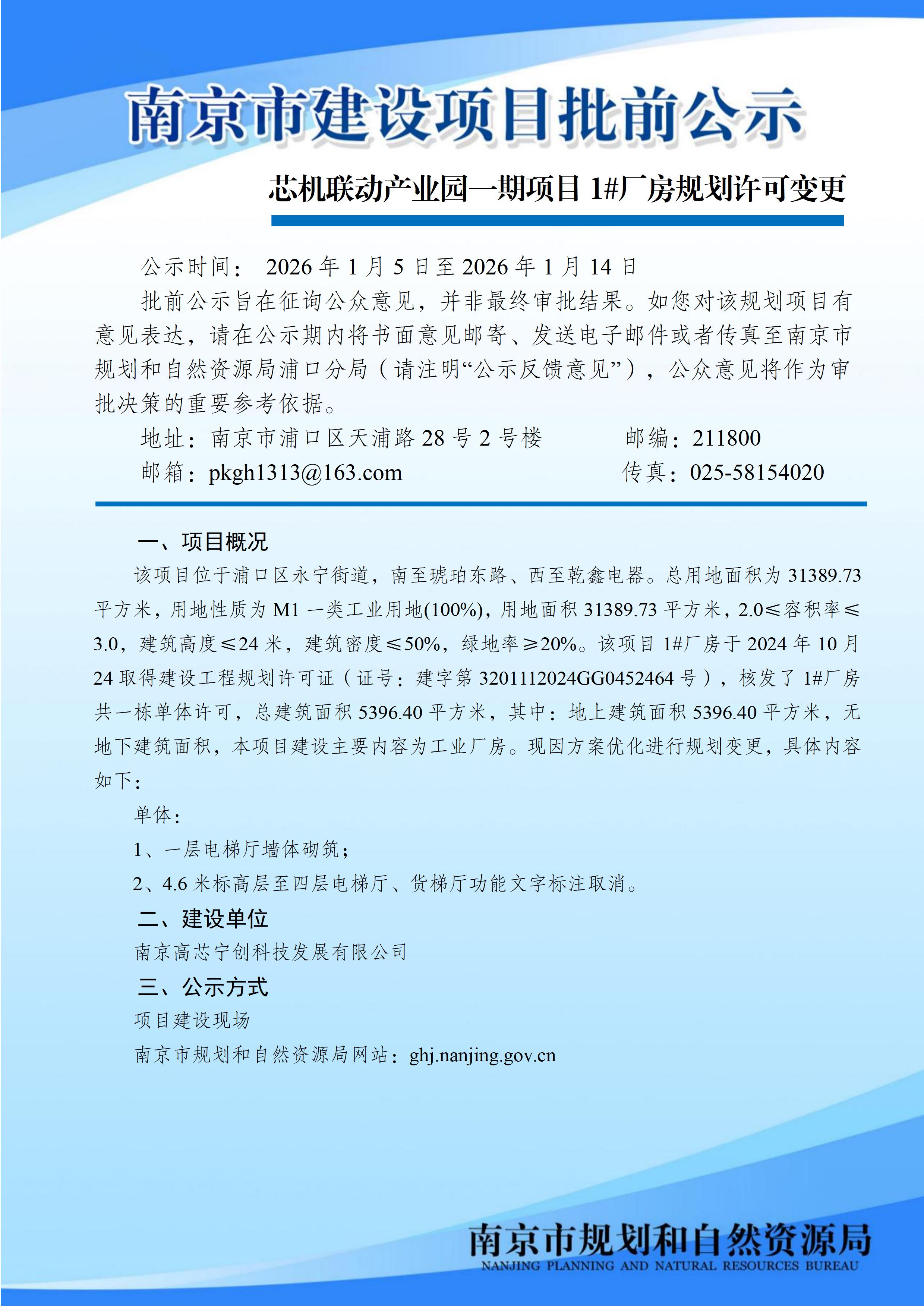 芯机联动产业园一期项目1#厂房规划许可变更批前公示