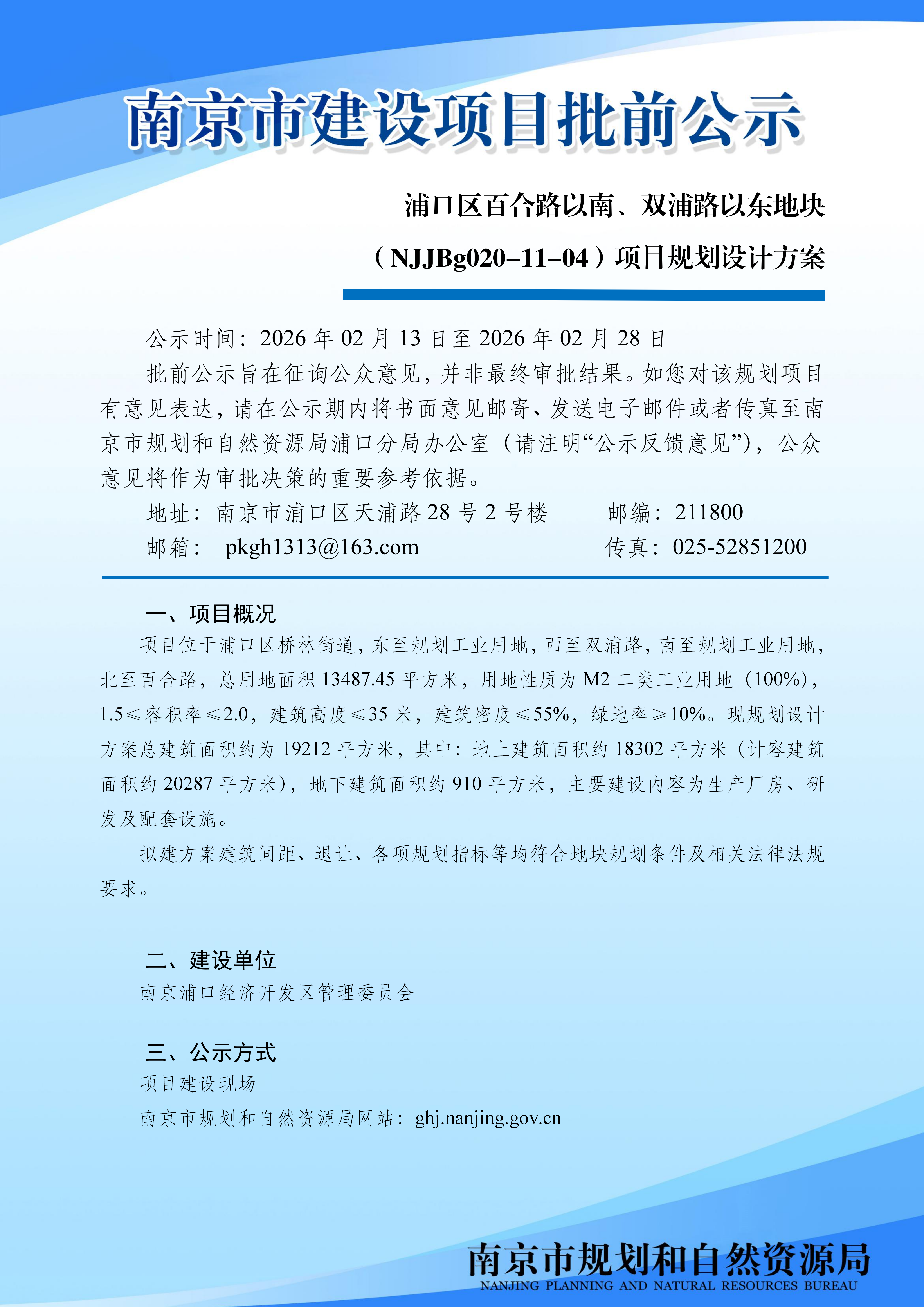 浦口区百合路以南、双浦路以东地块(NJJBg020-11-04)项目规划设计方案批前公示