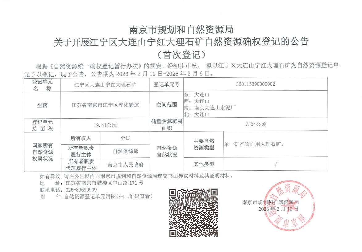 江苏省自然资源厅关于开展江宁区大连山宁红大理石矿自然资源确权登记的公告(首次登记)