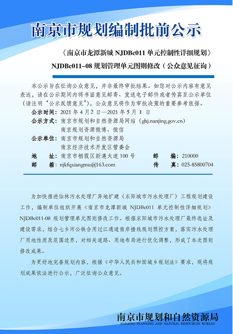 《南京市龙潭新城NJDBc011单元控制性详细规划》 NJDBc011-08规划管理单元图则修改(公众意见征询)