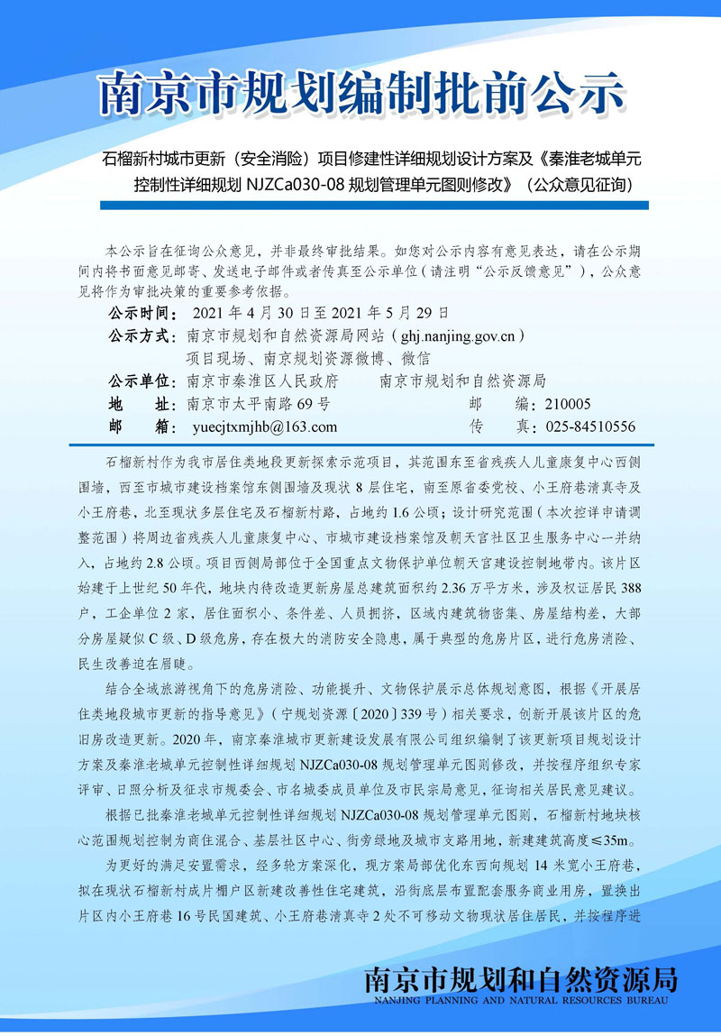 《石榴新村城市更新(安全消险)项目修建性详细规划设计方案暨秦淮老城单元控制性详细规划NJZCa030-08规划管理单元图则修改》(公众意见征询)
