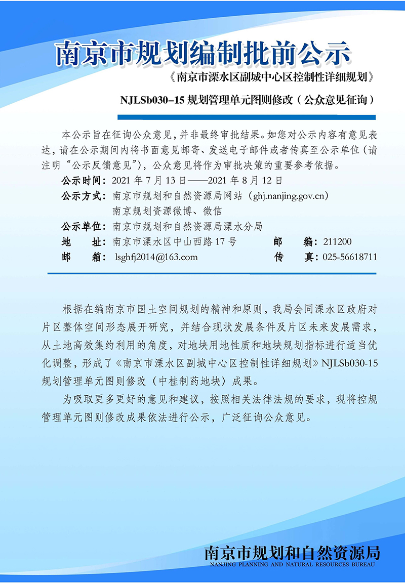 《南京市溧水区副城中心区控制性详细规划》NJLSb030-15规划管理单元图则修改(公众意见征询)