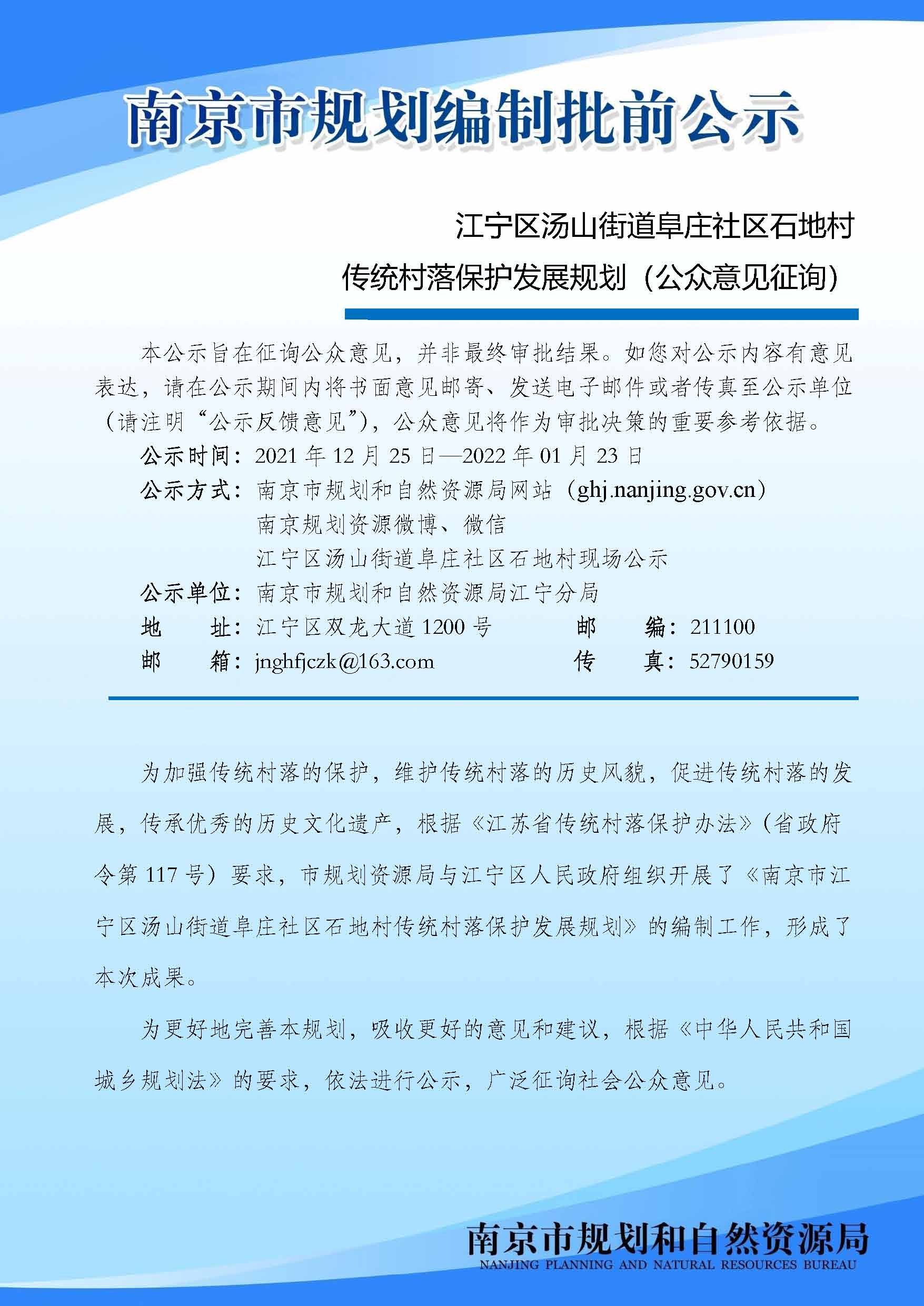 《江宁区汤山街道阜庄社区石地村传统村落保护发展规划》(公众意见征询)