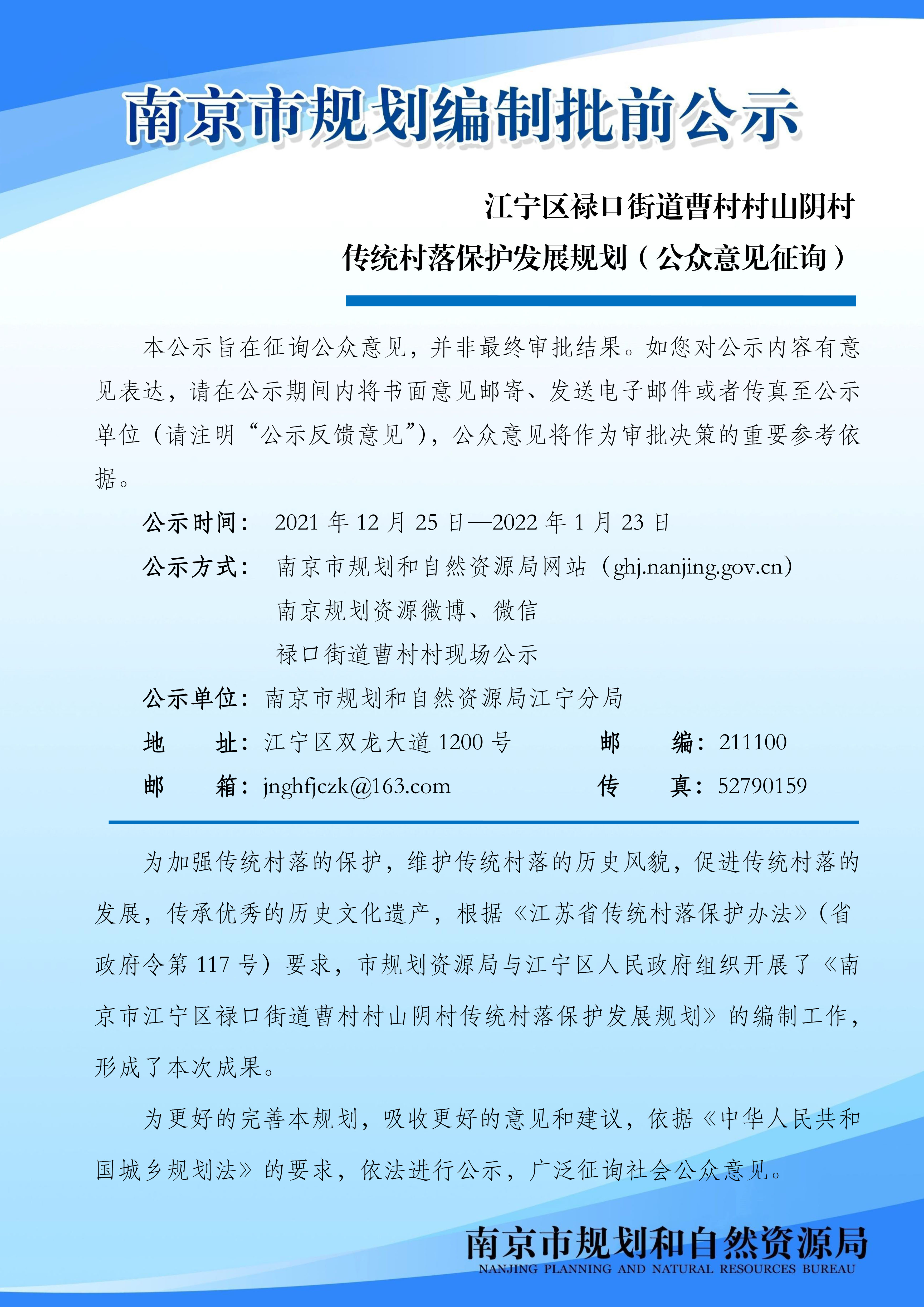 《江宁区禄口街道曹村村山阴村传统村落保护发展规划》(公众意见征询)