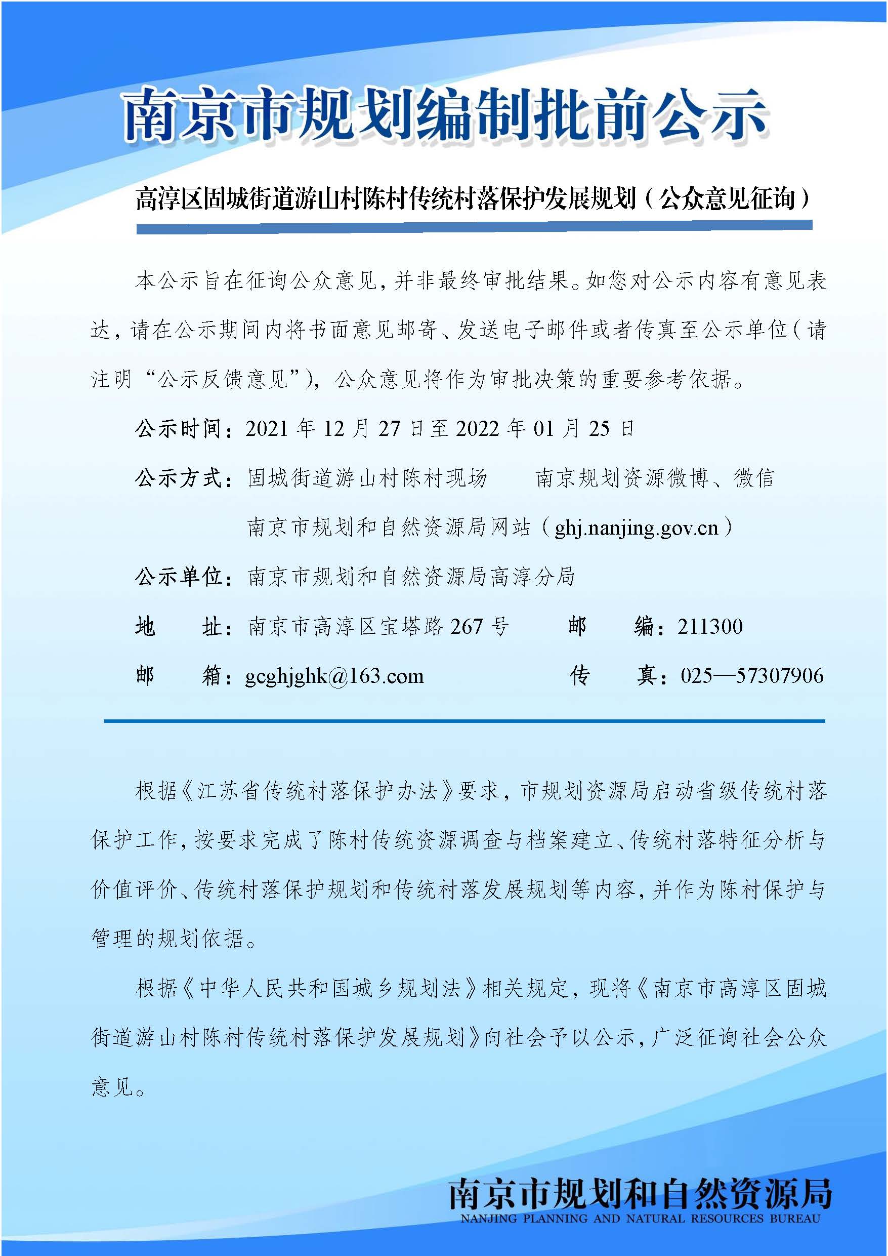 《高淳区固城街道游山村陈村传统村落保护发展规划》(公众意见征询)