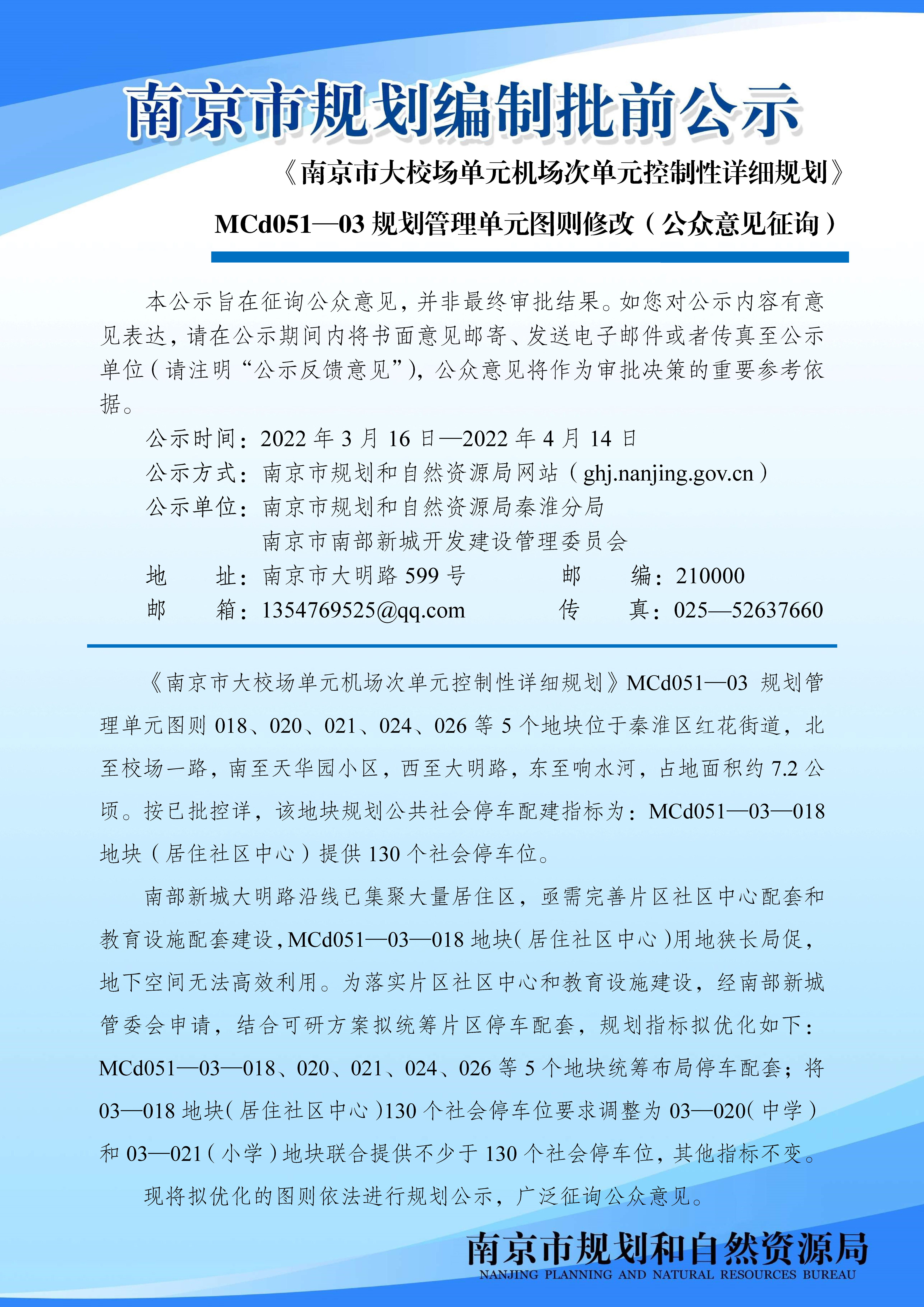 《南京大校场单元机场次单元控制性详细规划》MCd051-03规划管理单元图则修改(公众意见征询)