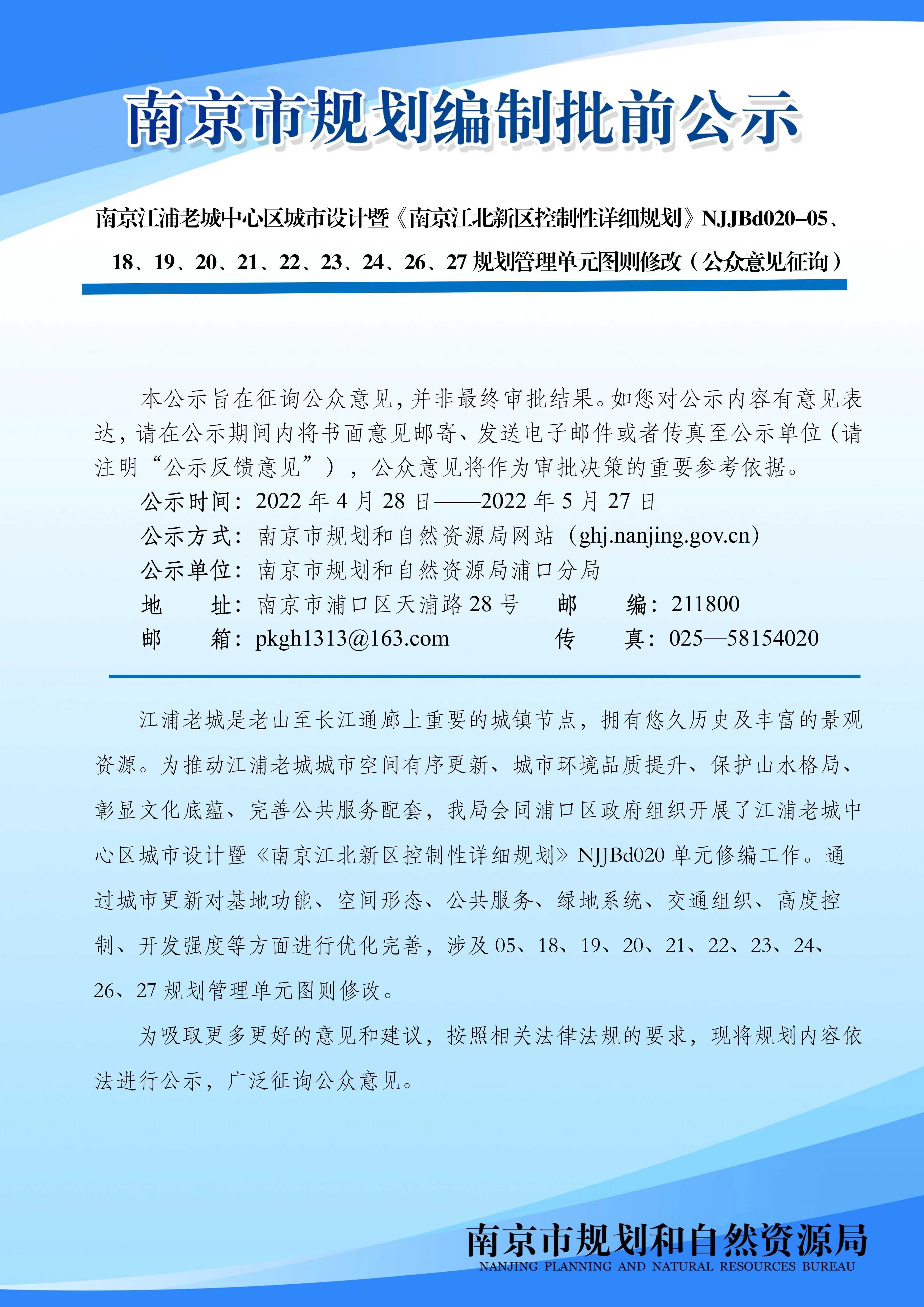 南京江浦老城中心区城市设计暨《南京江北新区控制性详细规划》NJJBd020-05、18、19、20、21、22、23、24、26、27规划管理单元图则修改(公众意见征询)