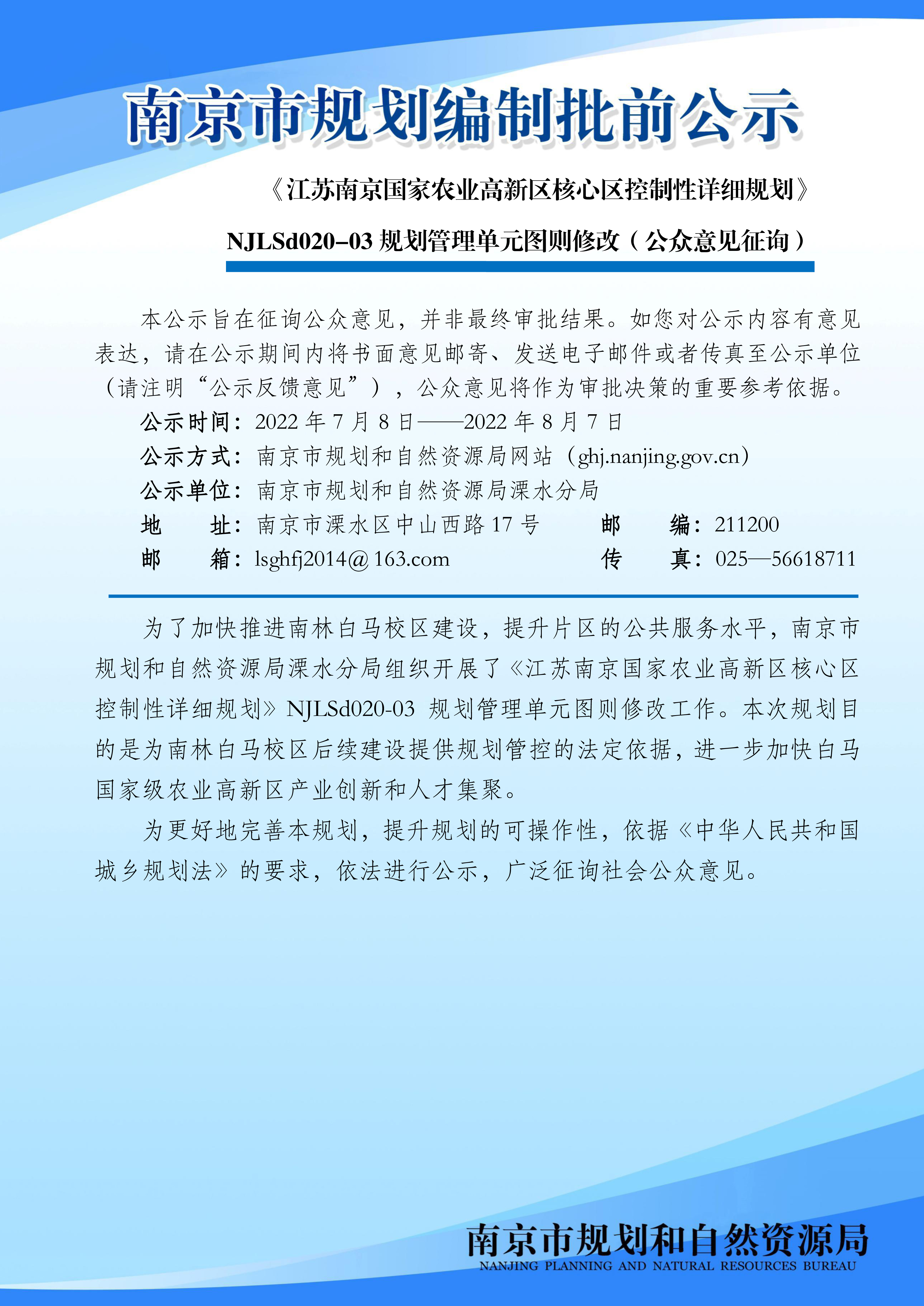 《江苏南京国家农业高新区核心区控制性详细规划》 NJLSd020-03规划管理单元图则修改(公众意见征询)