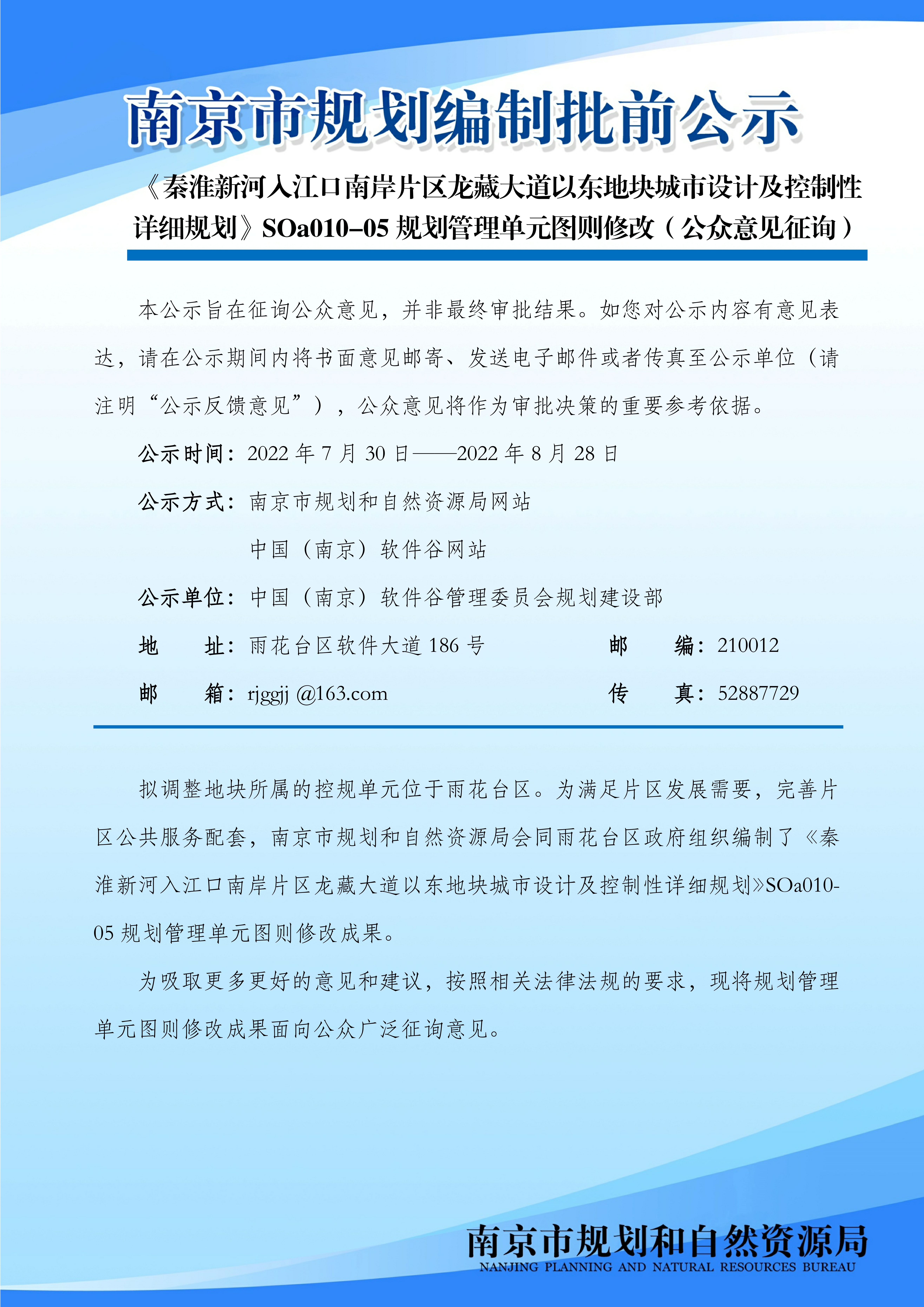 《秦淮新河入江口南岸片区龙藏大道以东地块城市设计及控制性详细规划》SOa010-05规划管理单元图则修改(公众意见征询)