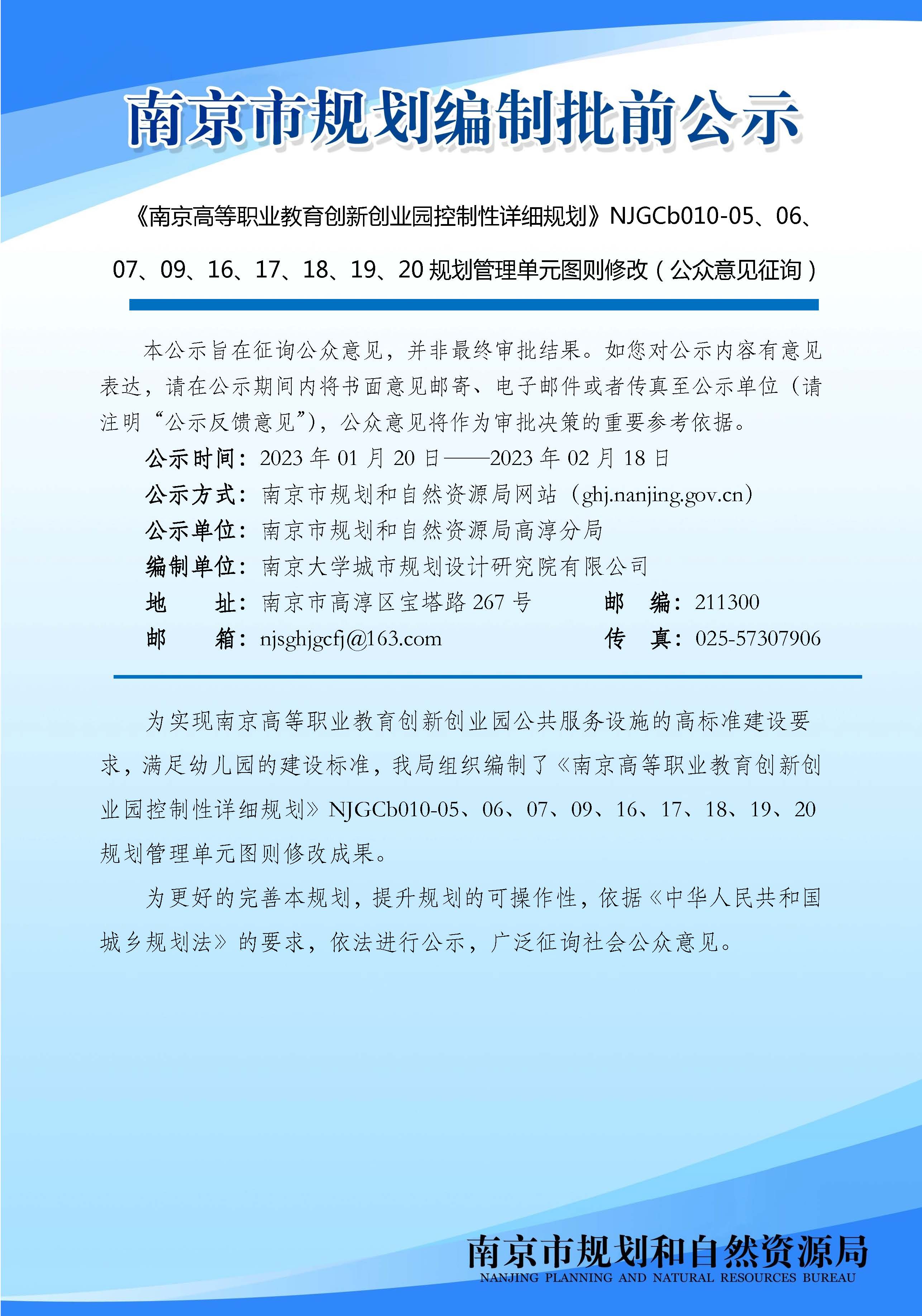 《南京高等职业教育创新创业园控制性详细规划》NJGCb010-05、06、07、09、16、17、18、19、20规划管理单元图则修改(公众意见征询)