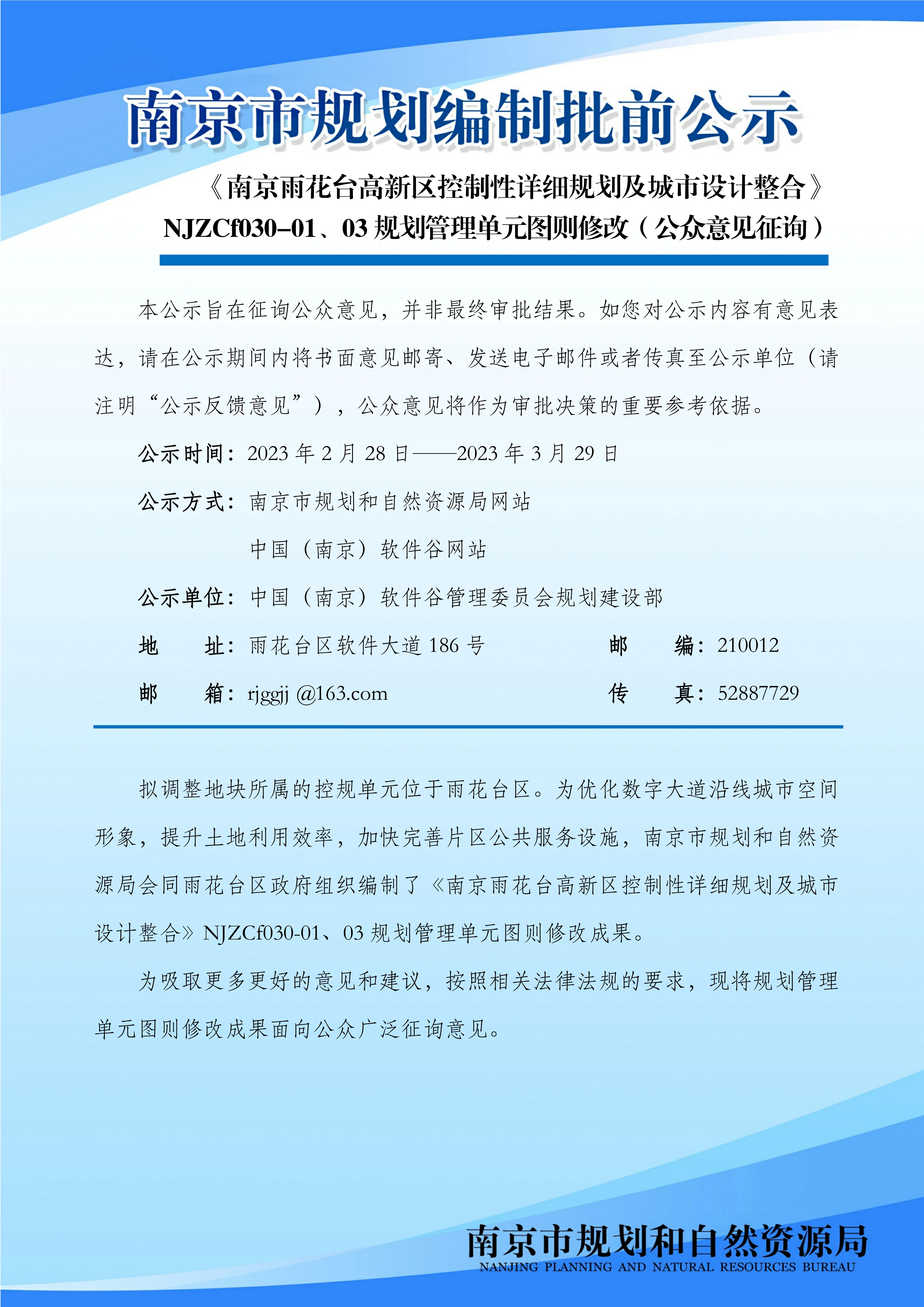 《南京雨花台高新区控制性详细规划及城市设计整合》NJZCf030-01、03规划管理单元图则修改(公众意见征询)