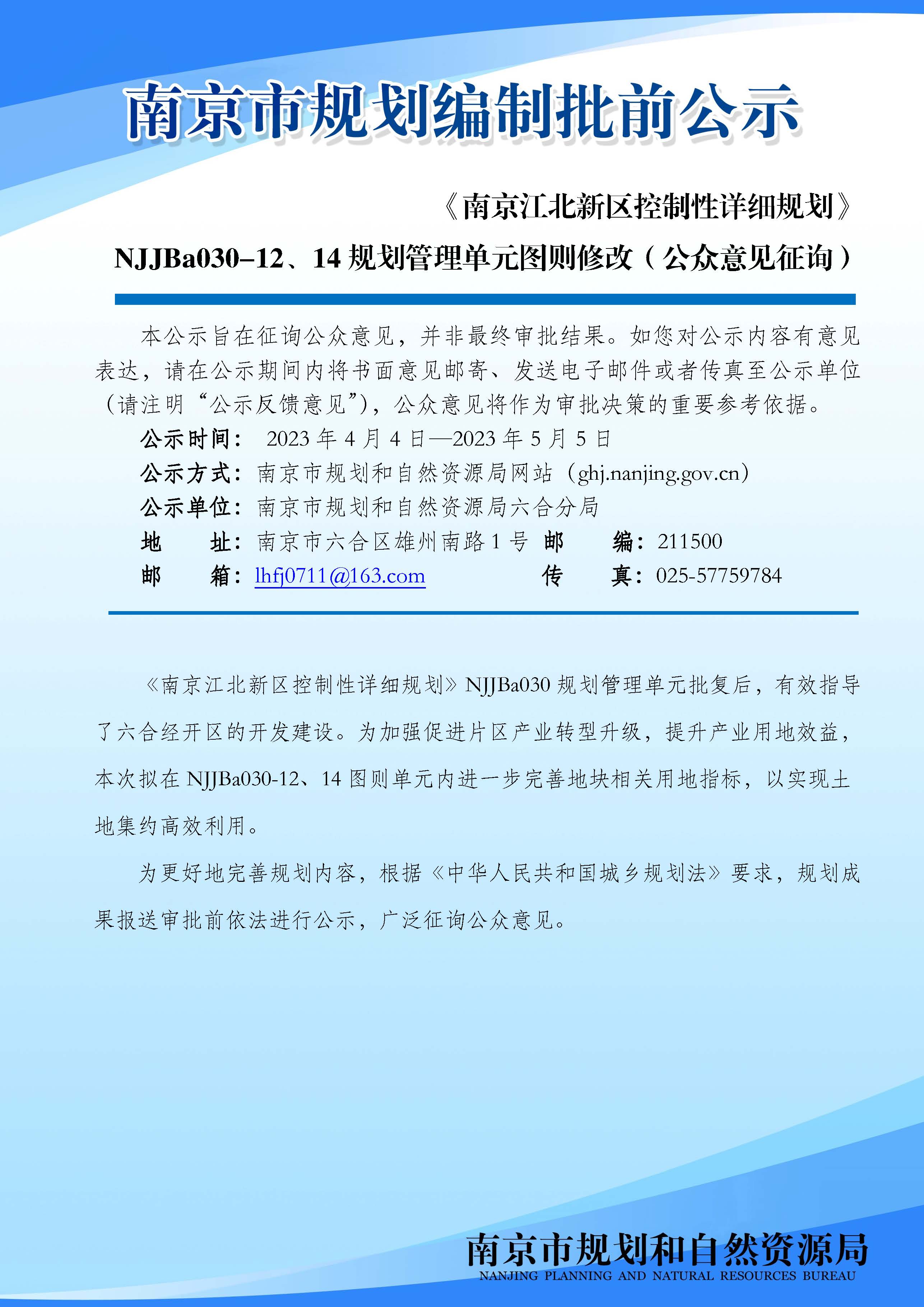 《南京江北新区控制性详细规划》NJJBa030-12、14规划管理单元图则修改(公众意见征询)