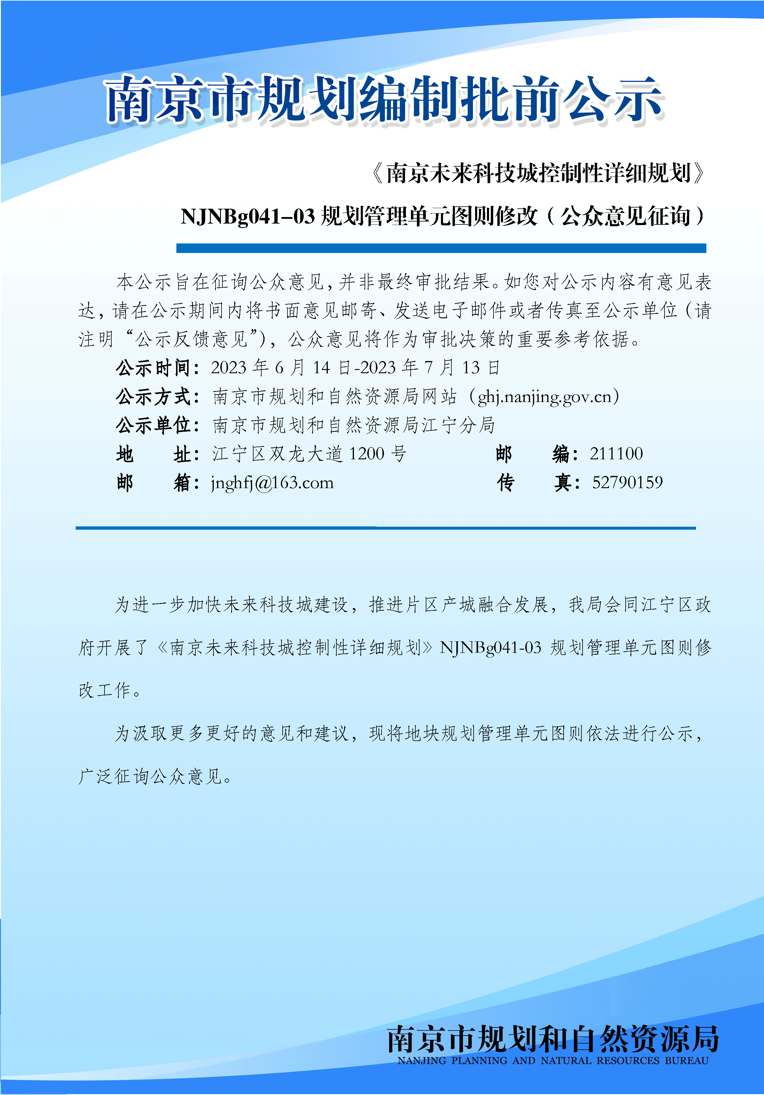 《南京未来科技城控制性详细规划》NJNBg041-03规划管理单元图则修改(公众意见征询)