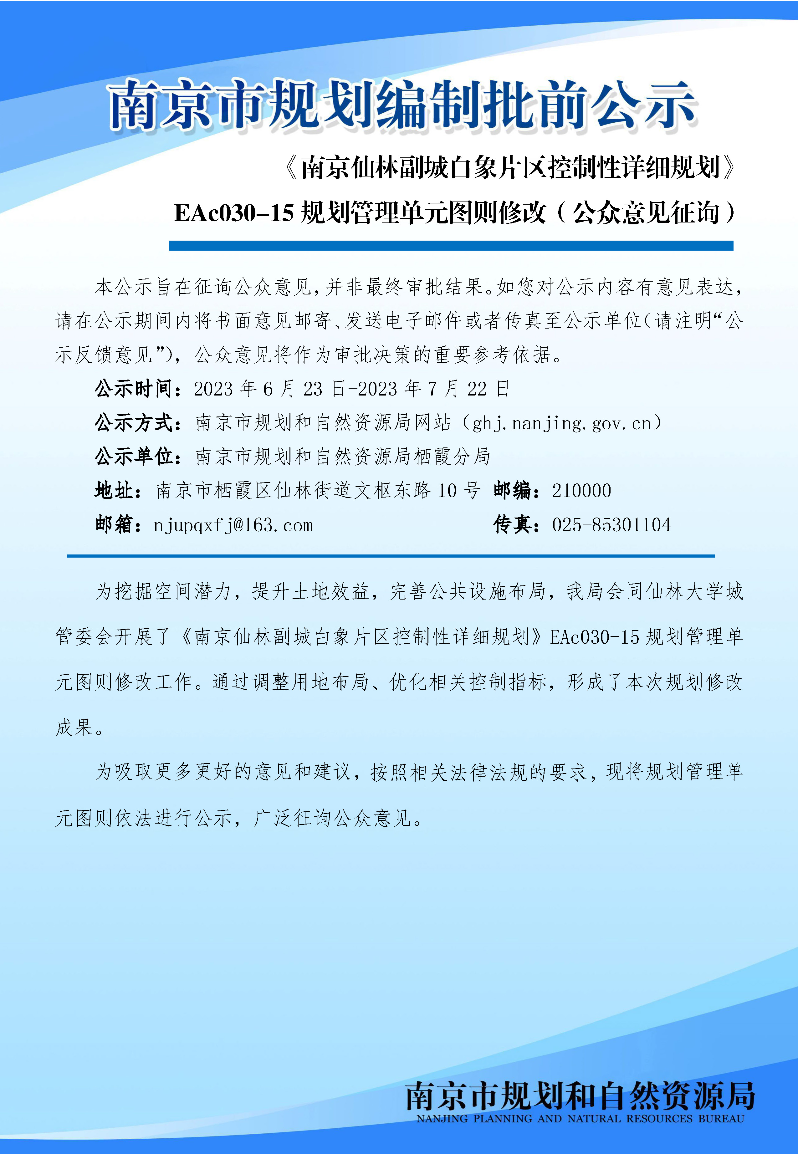 《南京仙林副城白象片区控制性详细规划》EAc030-15规划管理单元图则修改(公众意见征询)