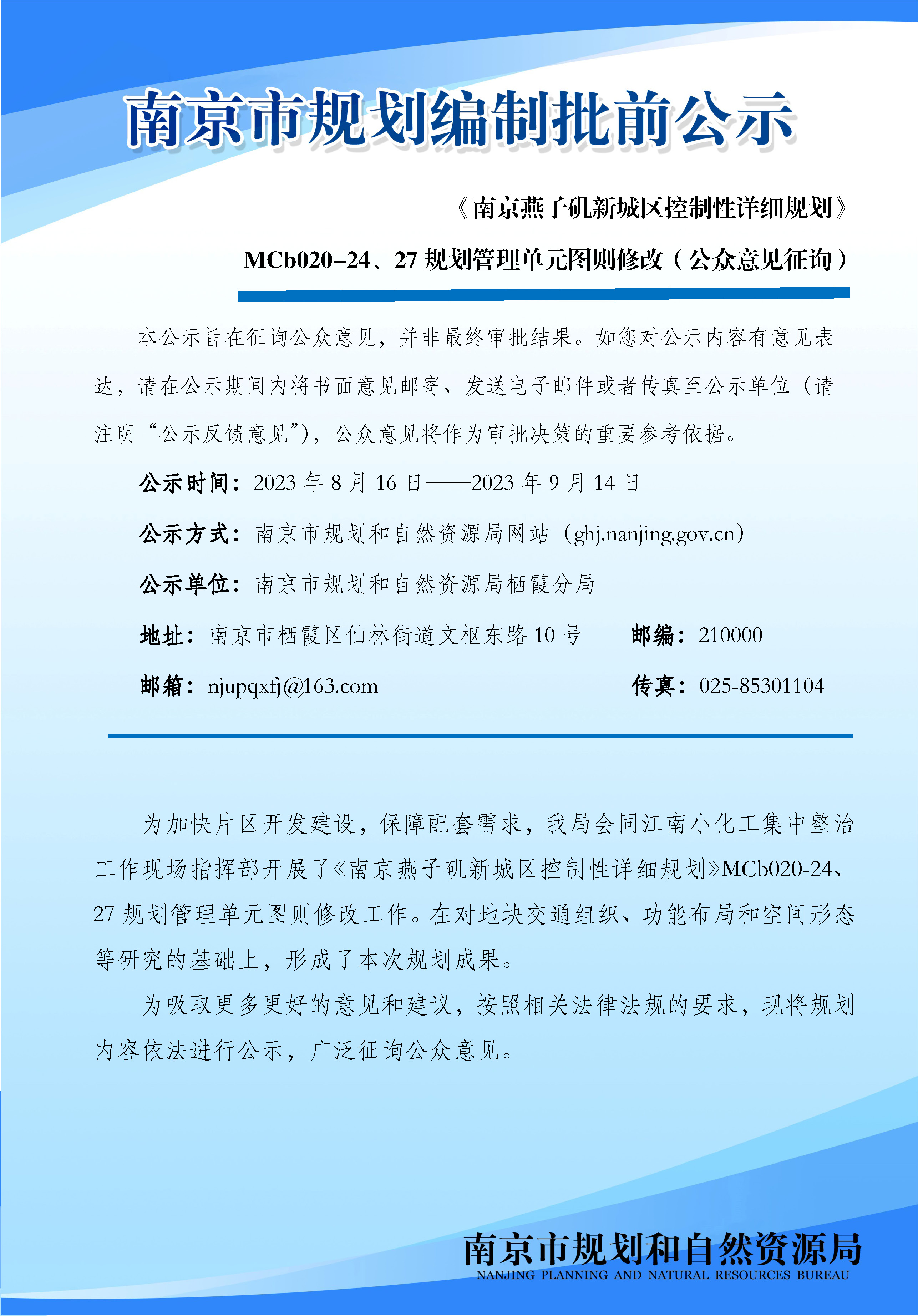 《燕子矶新城区控制性详细规划》MCb020-24、27规划管理单元图则修改(公众意见征询)