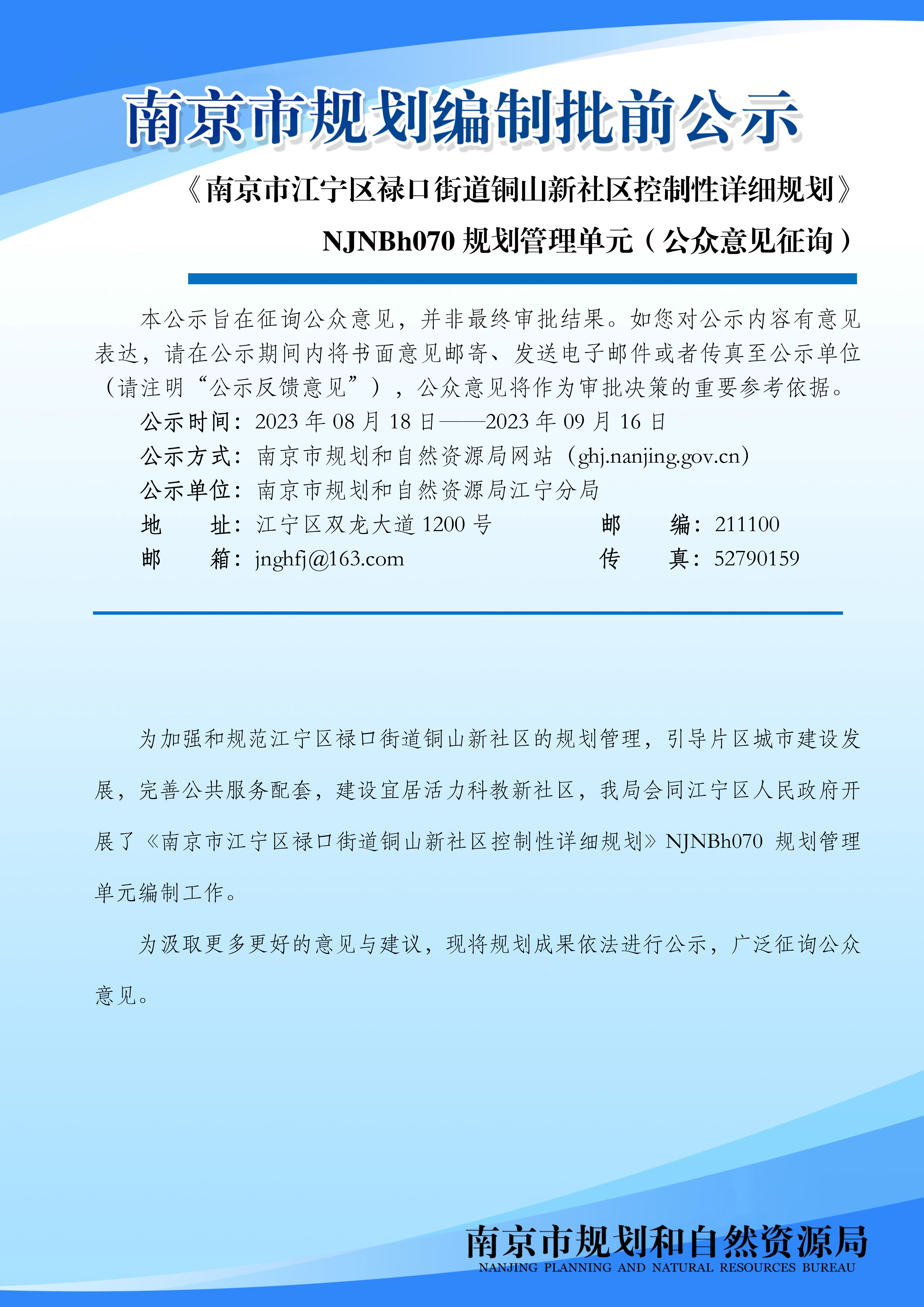 《南京市江宁区禄口街道铜山新社区控制性详细规划》NJNBh070规划管理单元(公众意见征询)