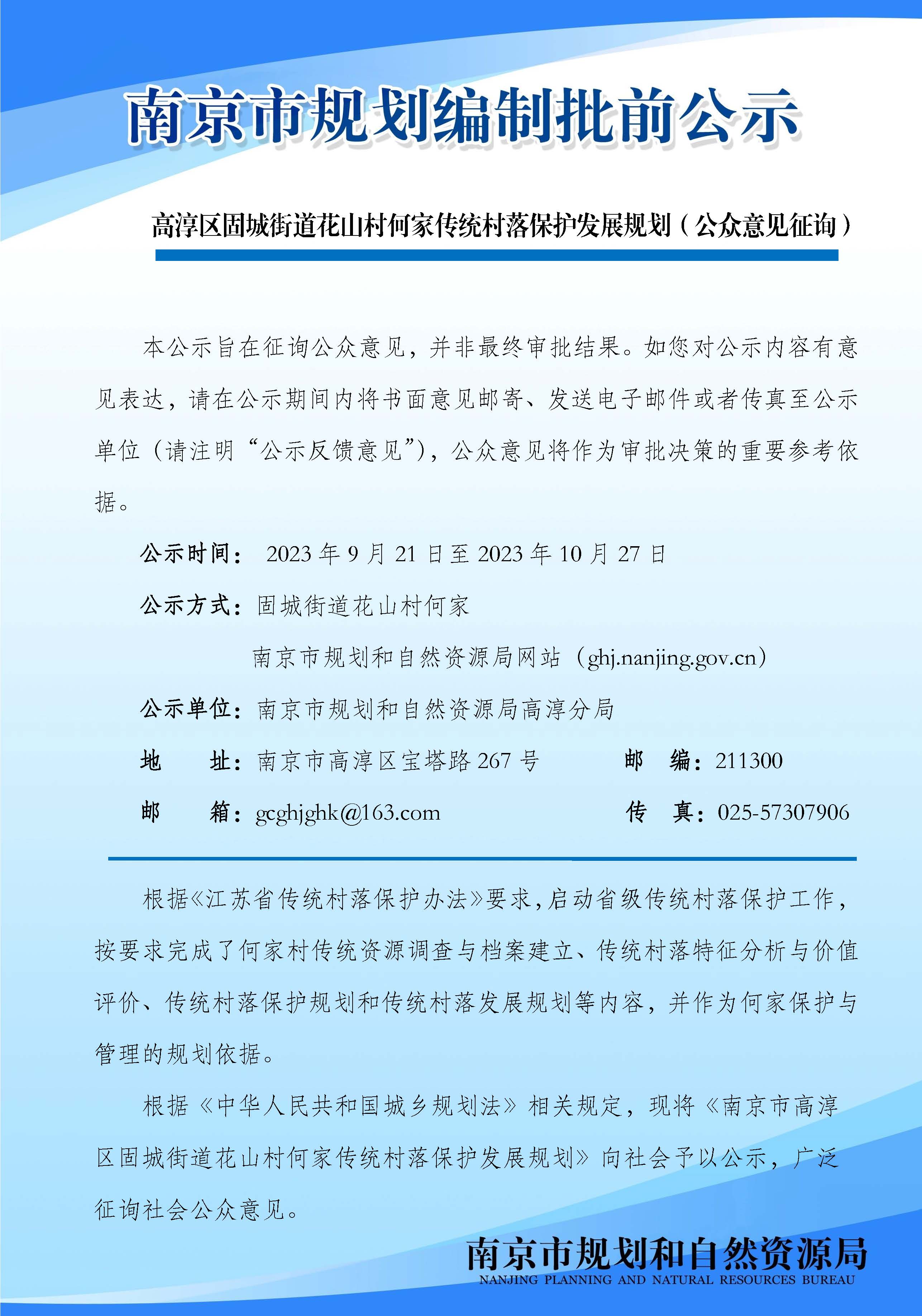 《南京市高淳区固城街道花山村何家传统村落保护发展规划》(公众意见征询)