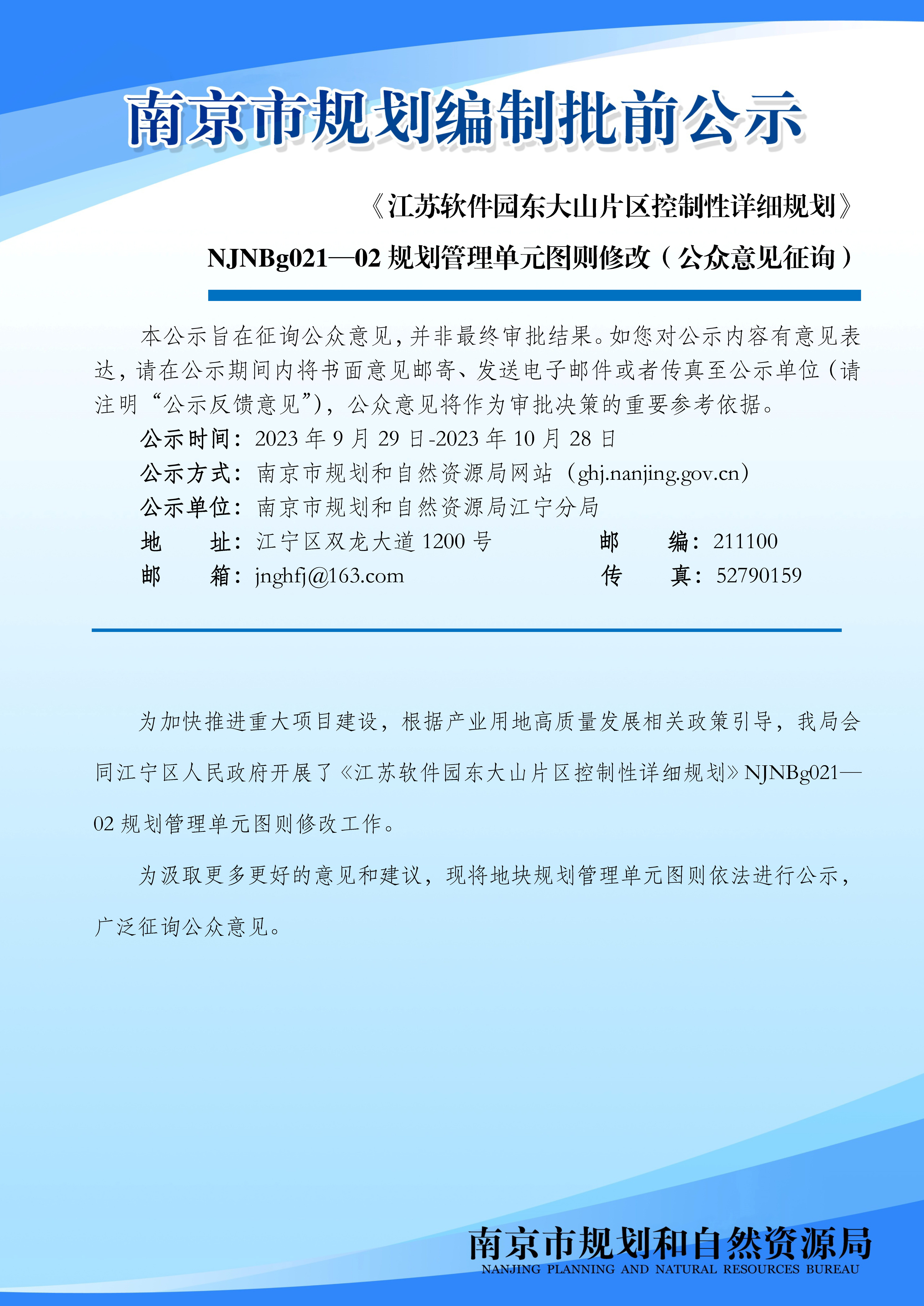 《江苏软件园东大山片区控制性详细规划》 NJNBg021—02规划管理单元图则修改(公众意见征询)