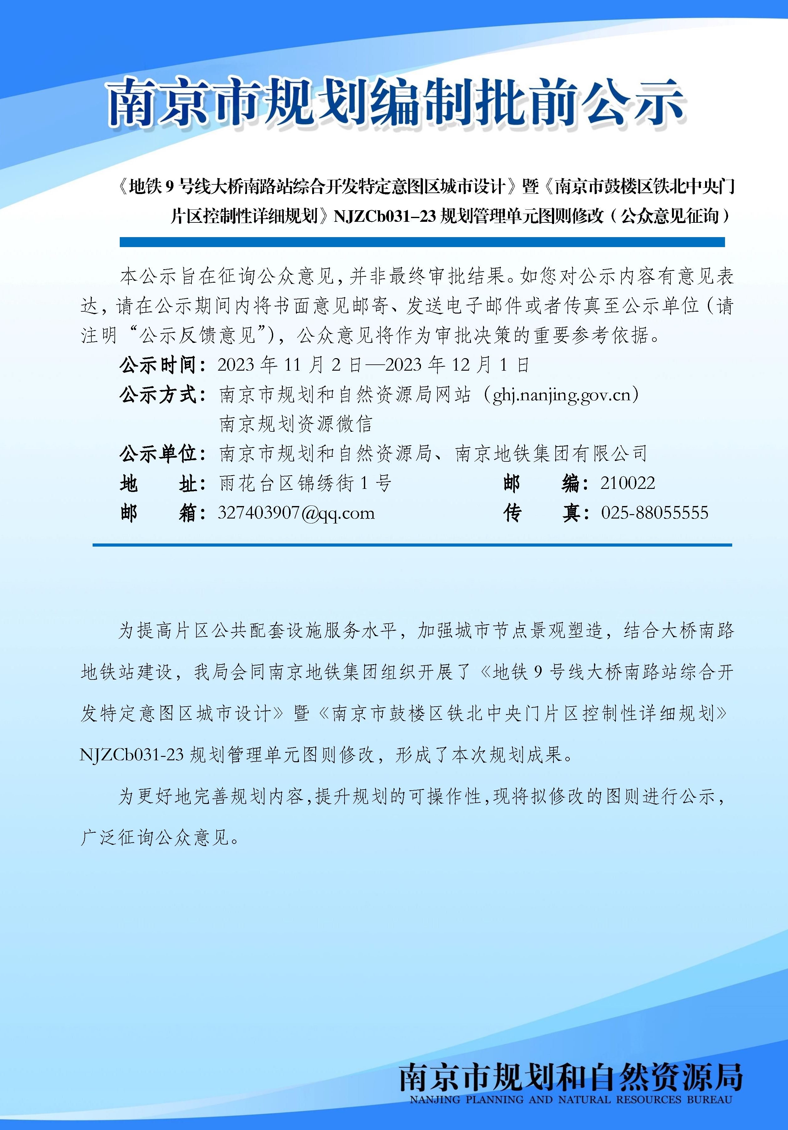 《地铁9号线大桥南路站综合开发特定意图区城市设计》暨《南京市鼓楼区铁北中央门片区控制性详细规划》NJZCb031-23规划管理单元图则修改(公众意见征询)
