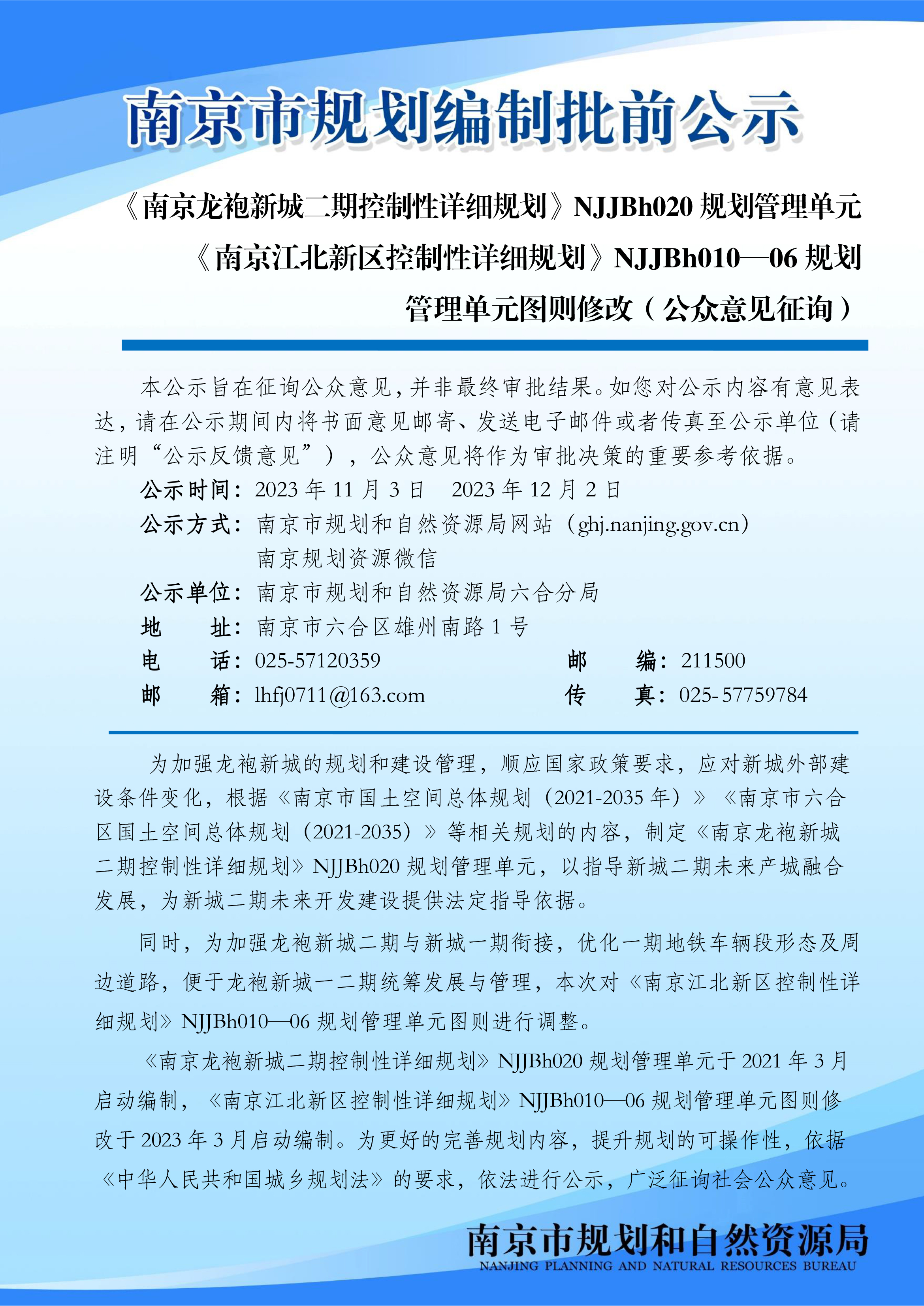 《南京龙袍新城二期控制性详细规划》NJJBh020规划管理单元及《南京江北新区控制性详细规划》NJJBh010-06规划管理单元图则修改(公众意见征询)