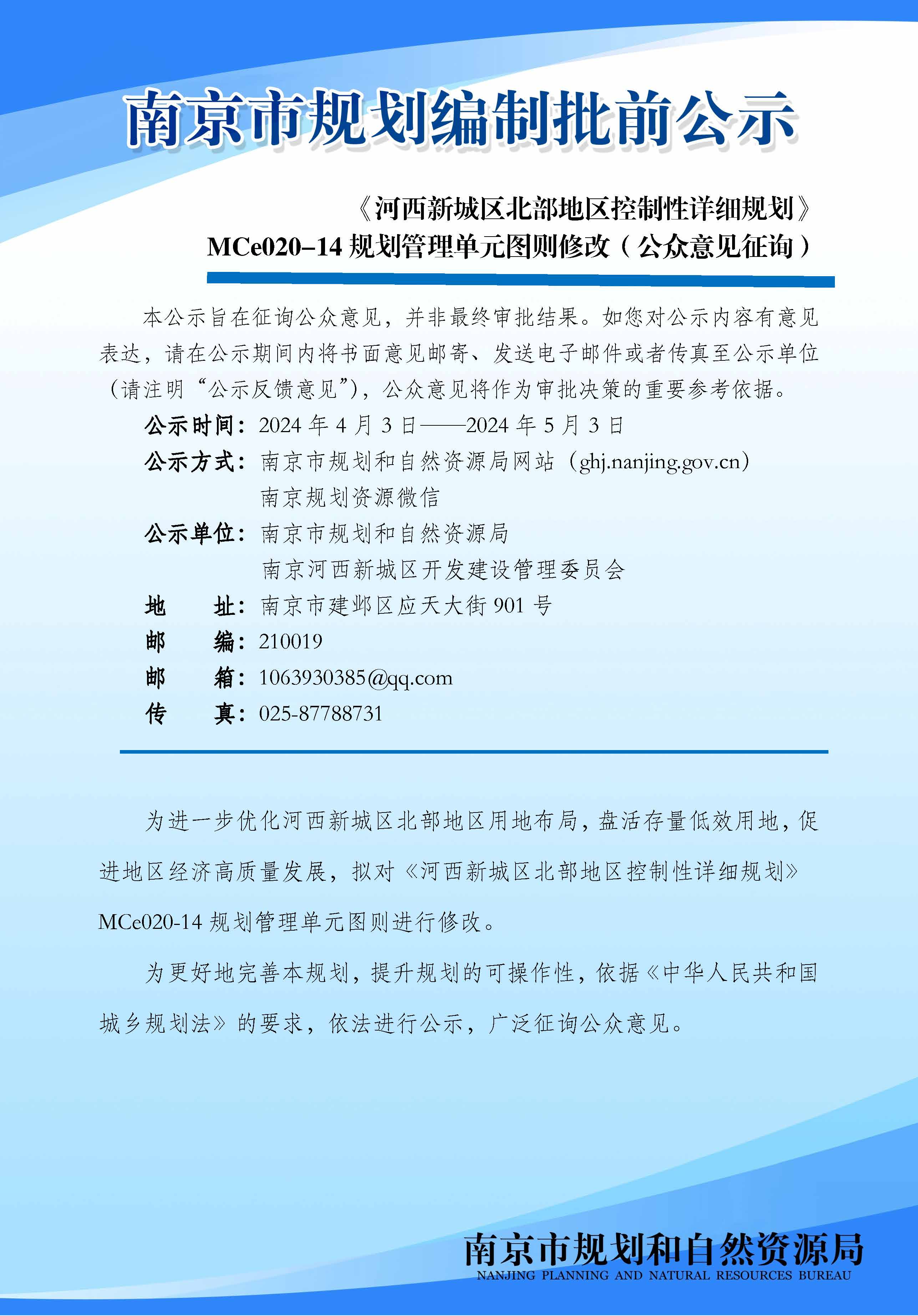 《河西新城区北部地区控制性详细规划》MCe020-14规划管理单元图则修改(公众意见征询)