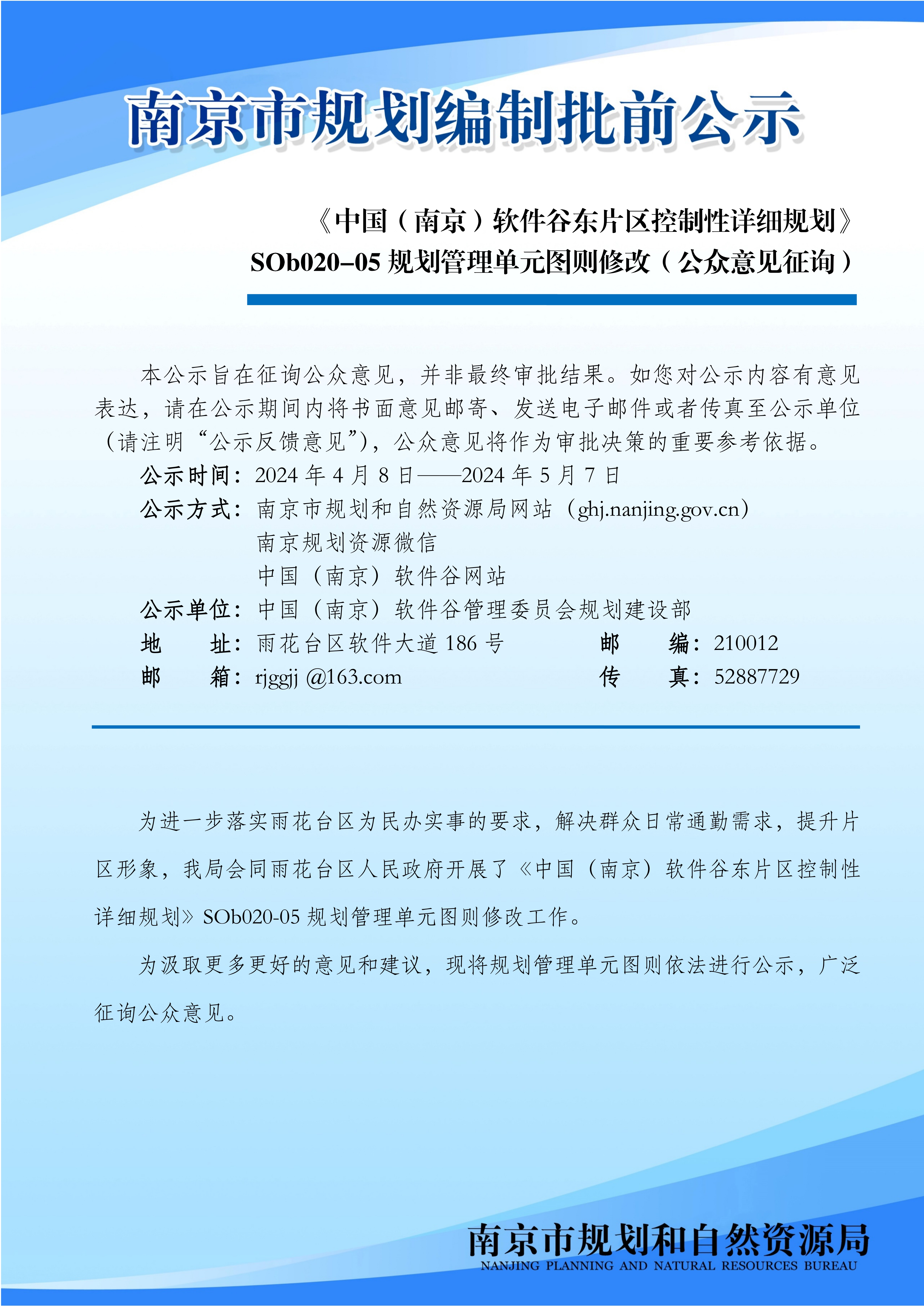 《中国(南京)软件谷东片区控制性详细规划》 SOb020-05规划管理单元图则修改(公众意见征询)