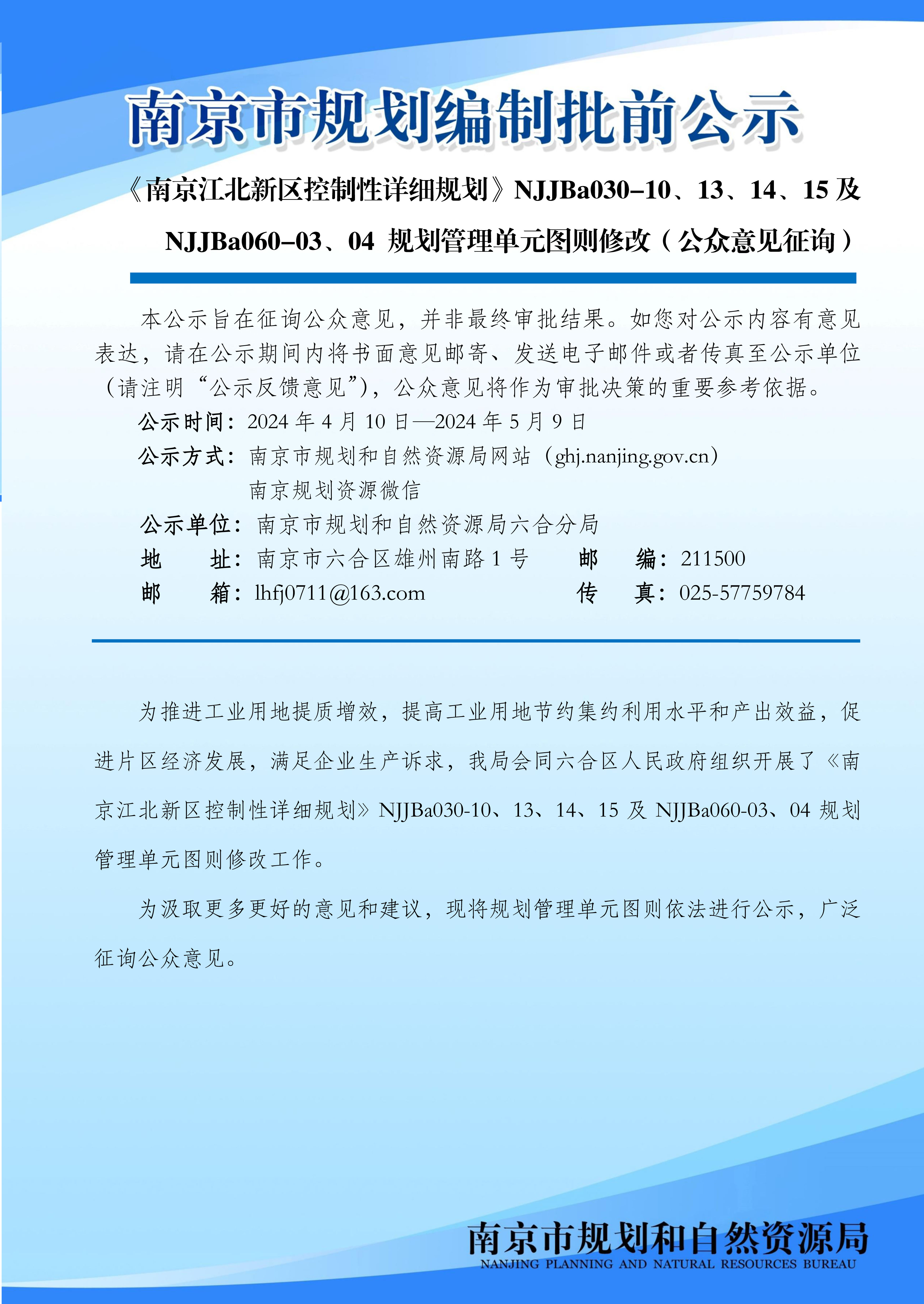 《南京江北新区控制性详细规划》NJJBa030-10、13、14、15及NJJBa060-03、04 规划管理单元图则修改(公众意见征询)