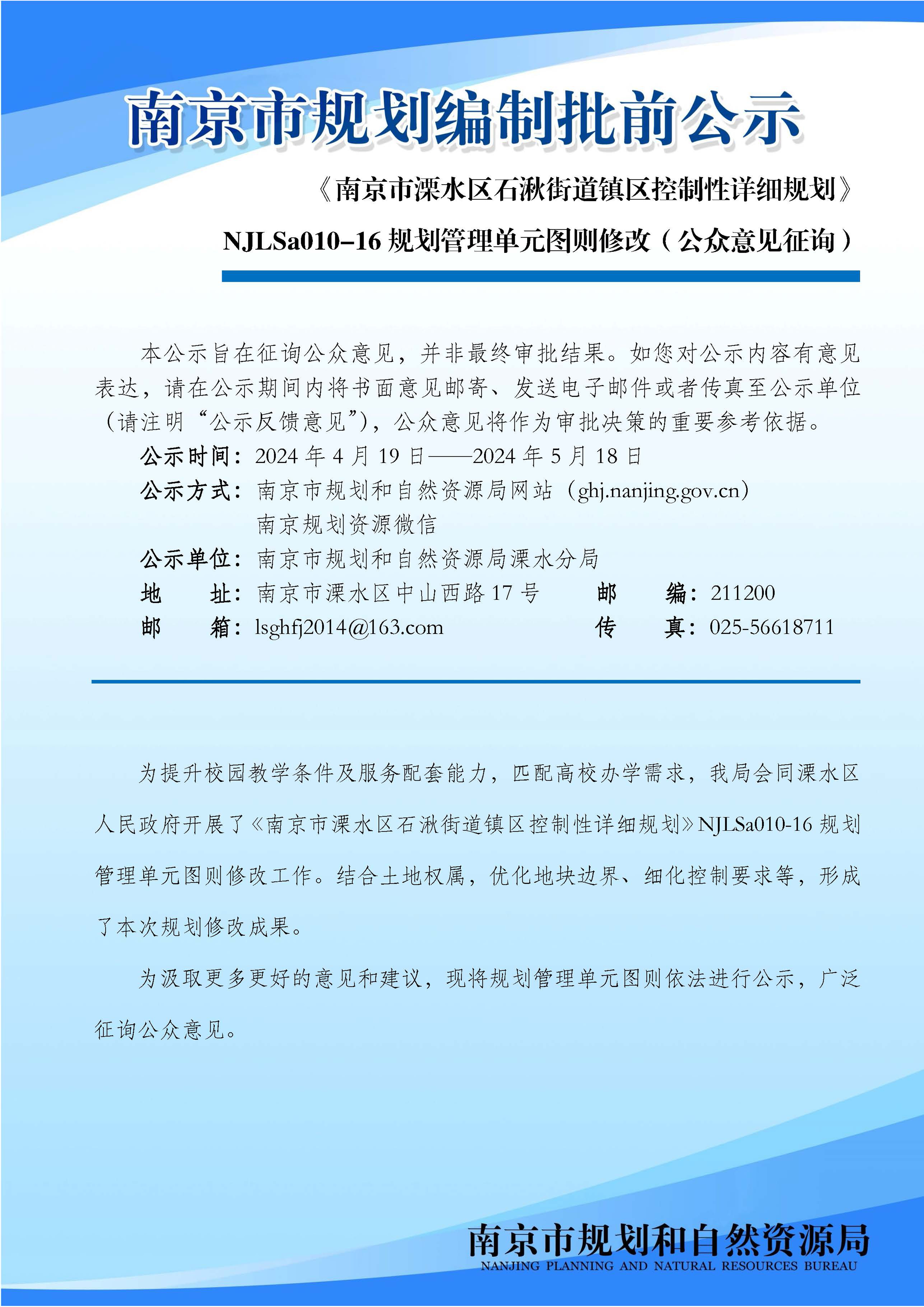 《南京市溧水区石湫街道镇区控制性详细规划》NJLSa010-16规划管理单元图则修改(公众意见征询)