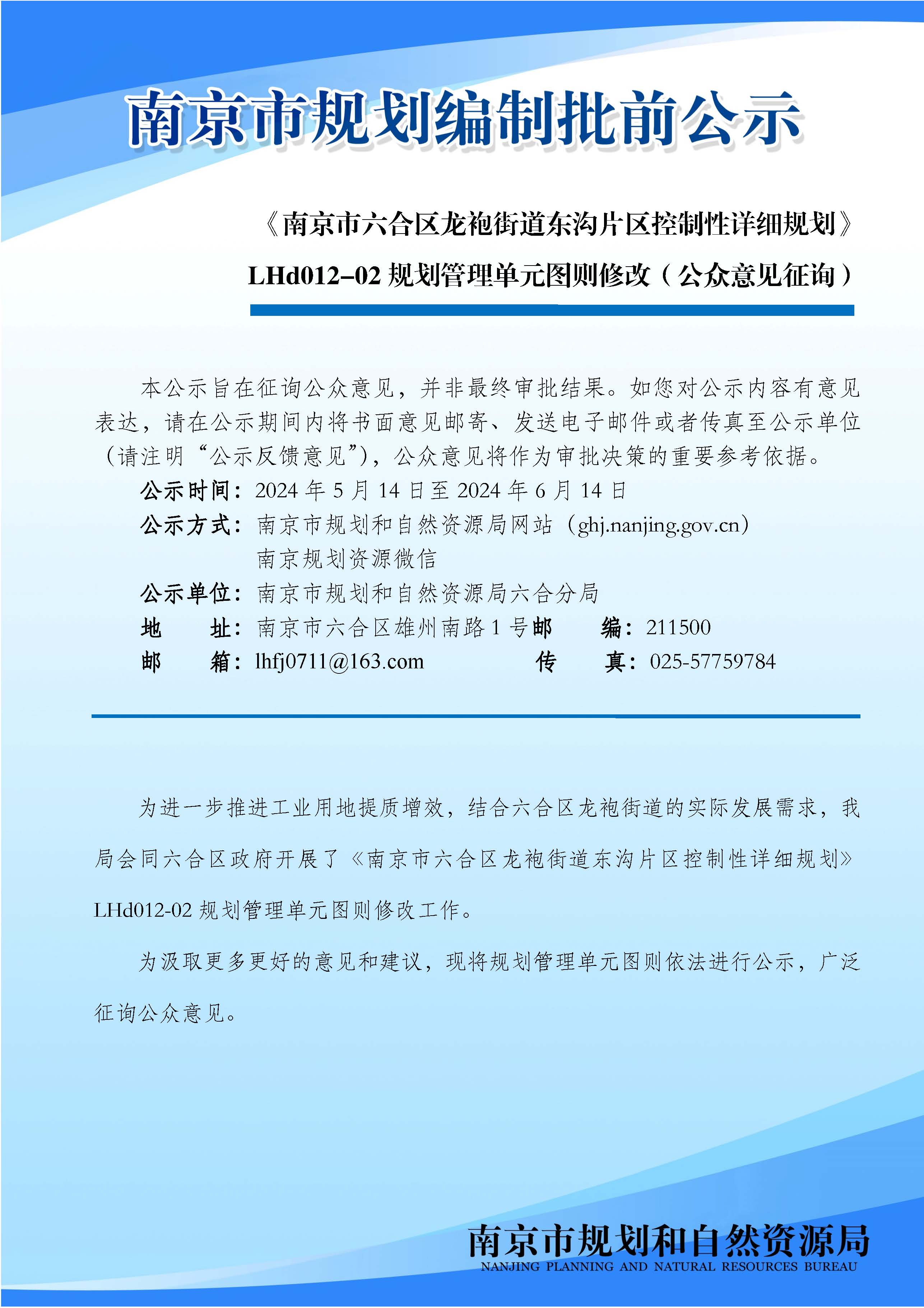 《南京市六合区龙袍街道东沟片区控制性详细规划》LHd012-02规划管理单元图则修改(批前公示)