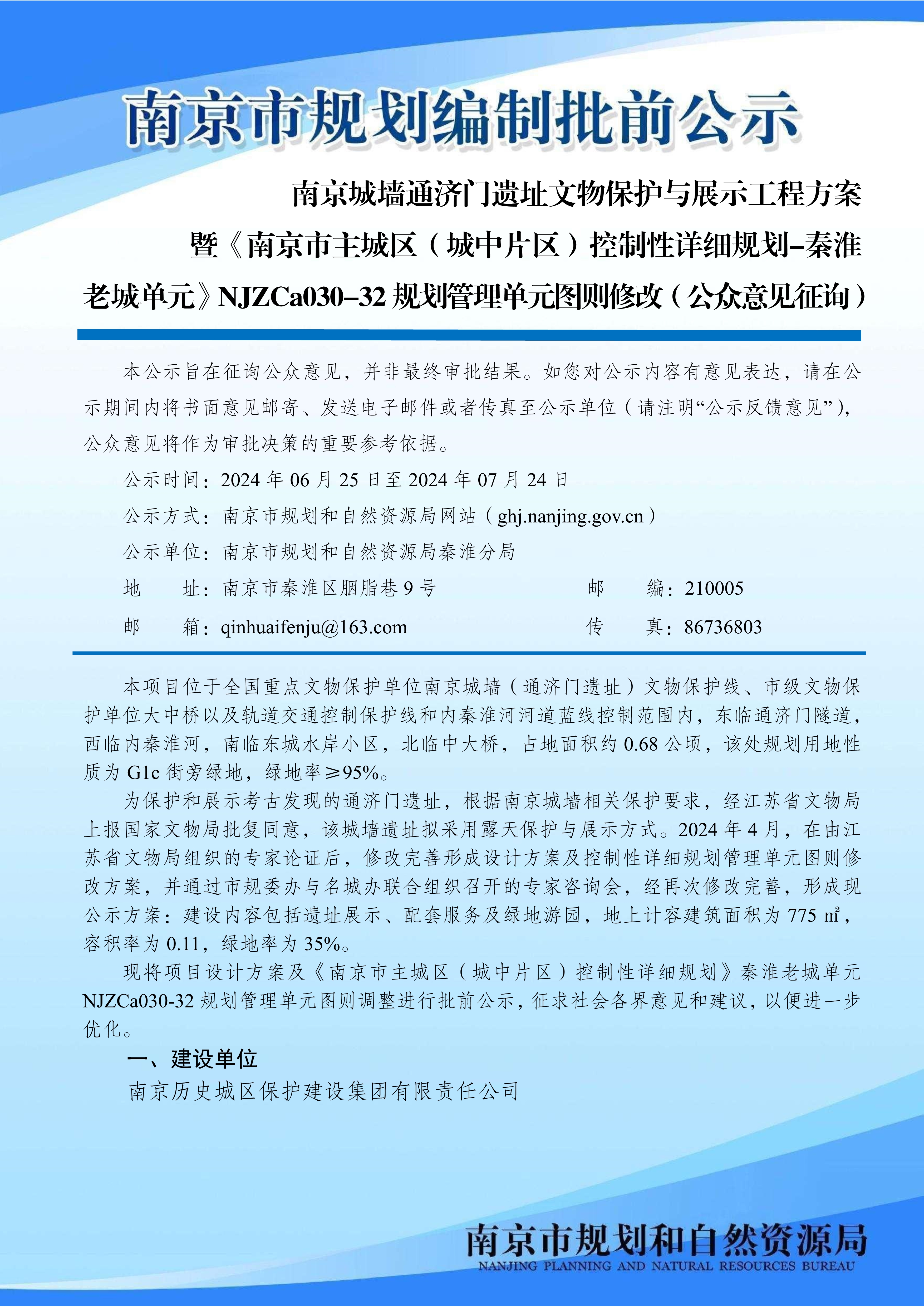 南京城墙通济门遗址文物保护与展示工程方案暨《南京市主城区(城中片区)控制性详细规划-秦淮老城单元》NJZCa030-32规划管理单元图则修改(公众意见征询)
