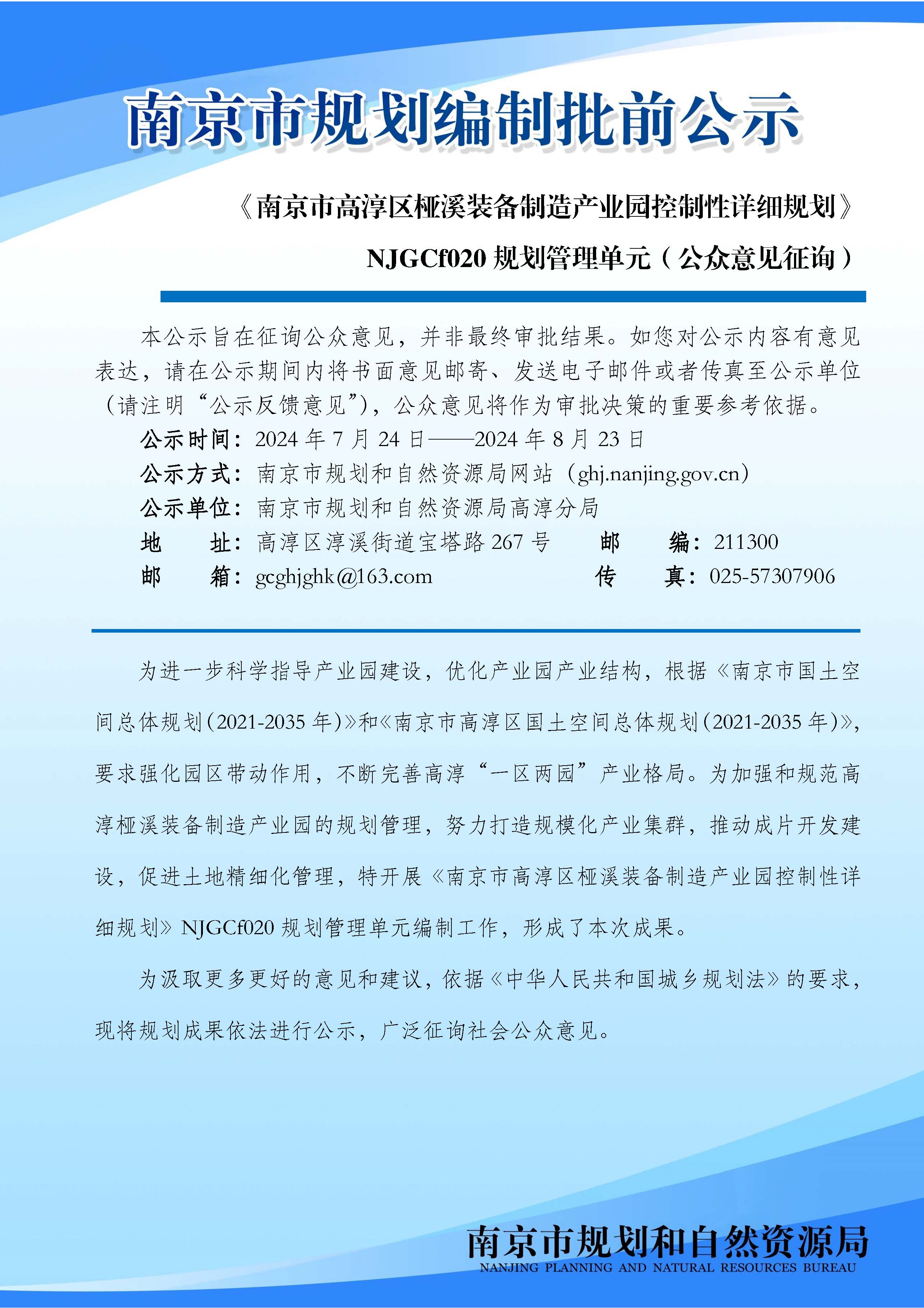 《南京市高淳区桠溪装备制造产业园控制性详细规划》NJGCf020规划管理单元(公众意见征询)