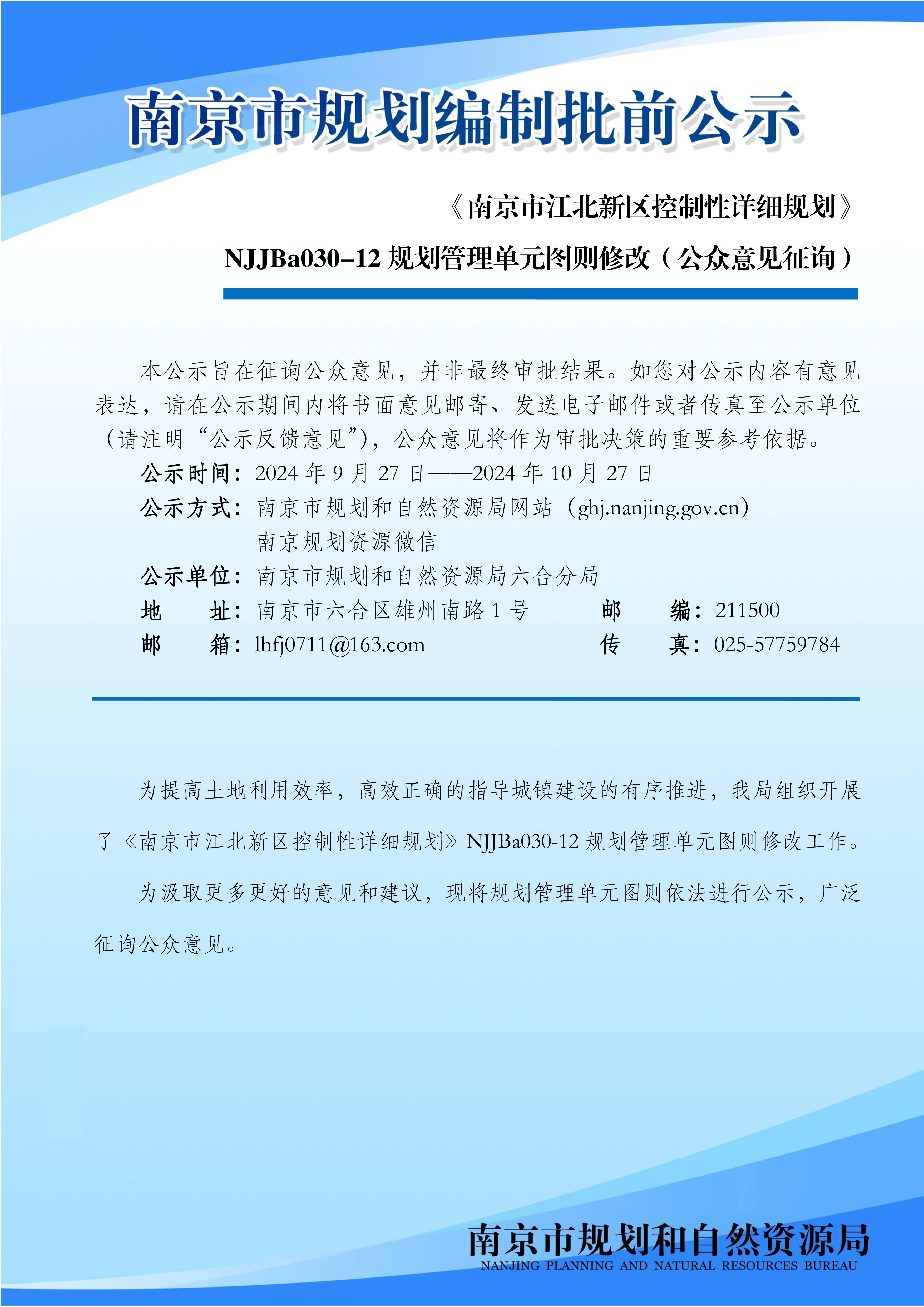 《南京市江北新区控制性详细规划》NJJBa030-12规划管理单元图则修改(公众意见征询)