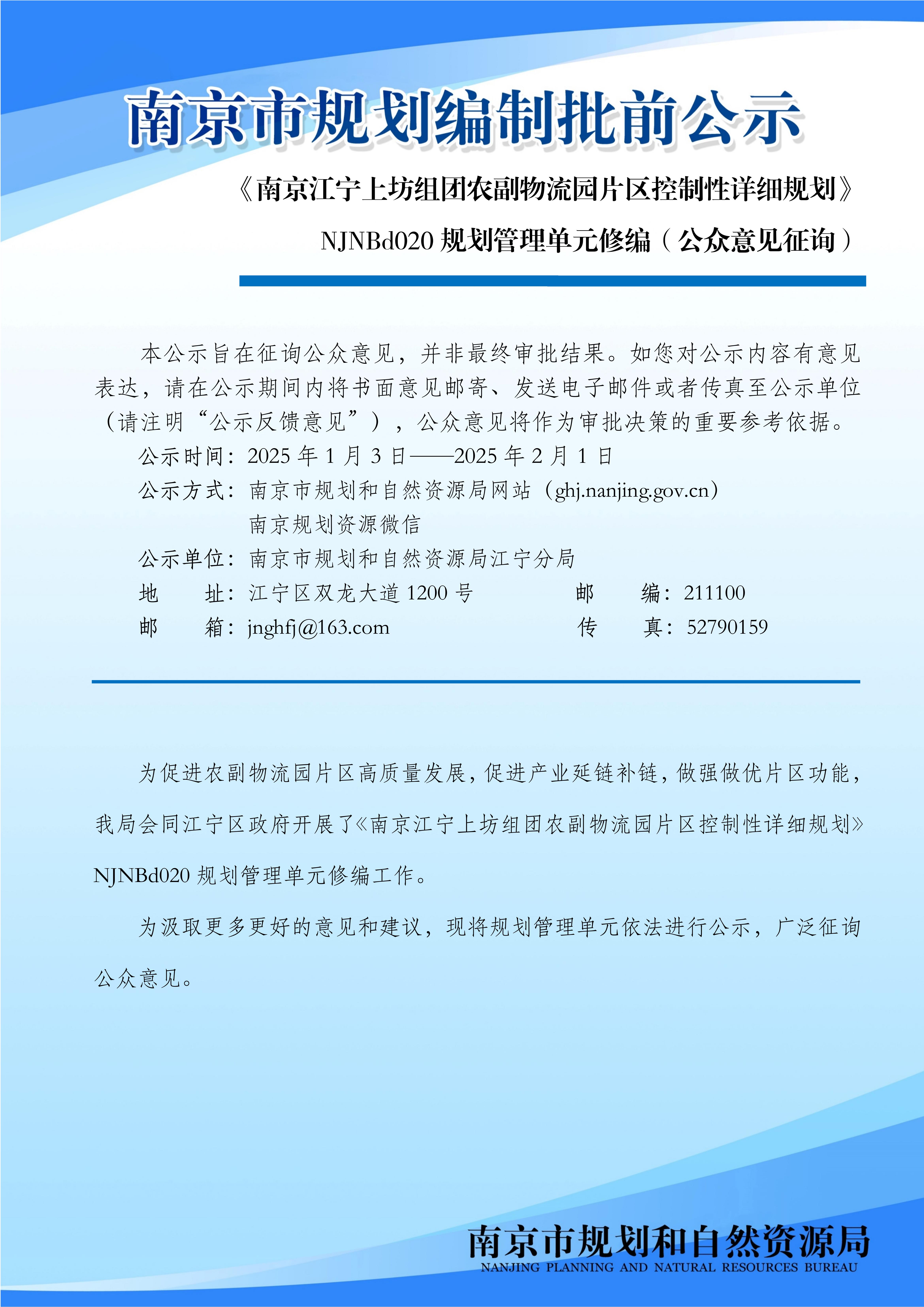 《南京江宁上坊组团农副物流园片区控制性详细规划》NJNBd020规划管理单元修编(公众意见征询)