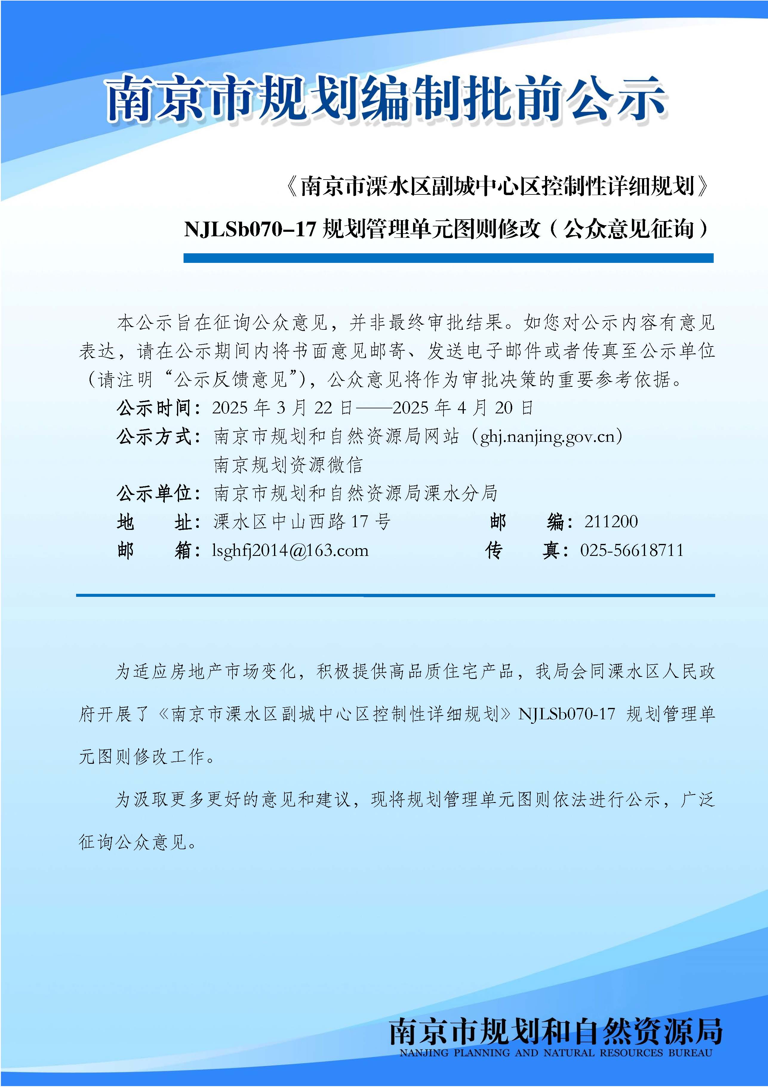 《南京市溧水区副城中心区控制性详细规划》NJLSb070-17规划管理单元图则修改(公众意见征询)