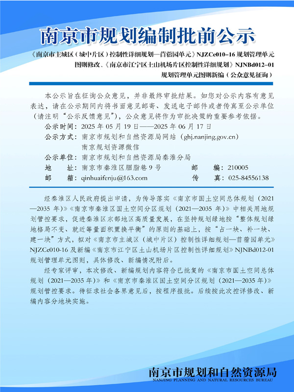 《南京市主城区(城中片区)控制性详细规划—苜蓿园单元》NJZCe010-16规划管理单元图则修改、《南京市江宁区土山机场片区控制性详细规划》NJNBd012-01规划管理单元图则新编(公众意见征询)