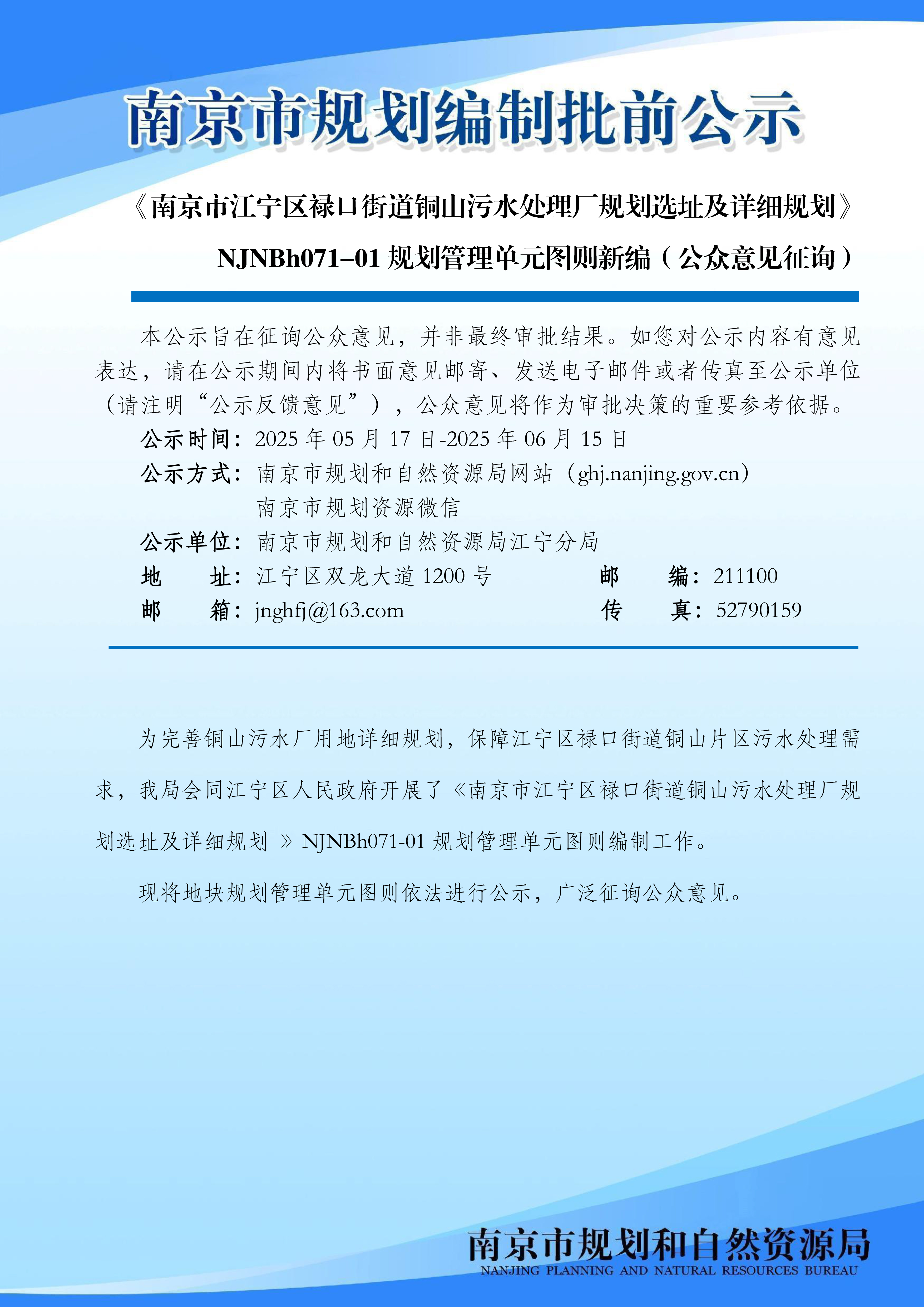 《南京市江宁区禄口街道铜山污水处理厂规划选址及详细规划》NJNBh071-01规划管理单元图则新编(公众意见征询)