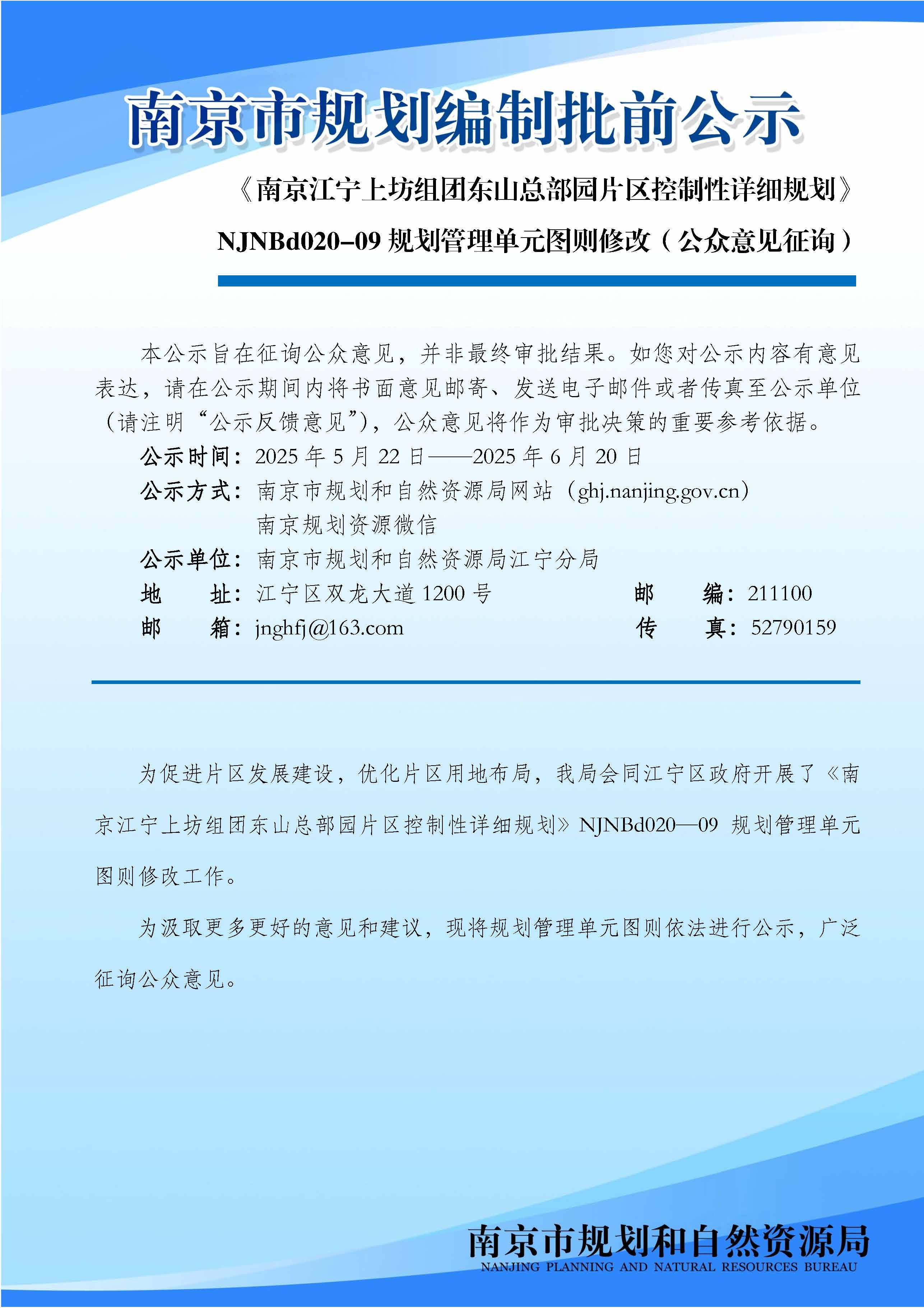《南京江宁上坊组团东山总部园片区控制性详细规划》NJNBd020-09规划管理单元图则修改(公众意见征询)