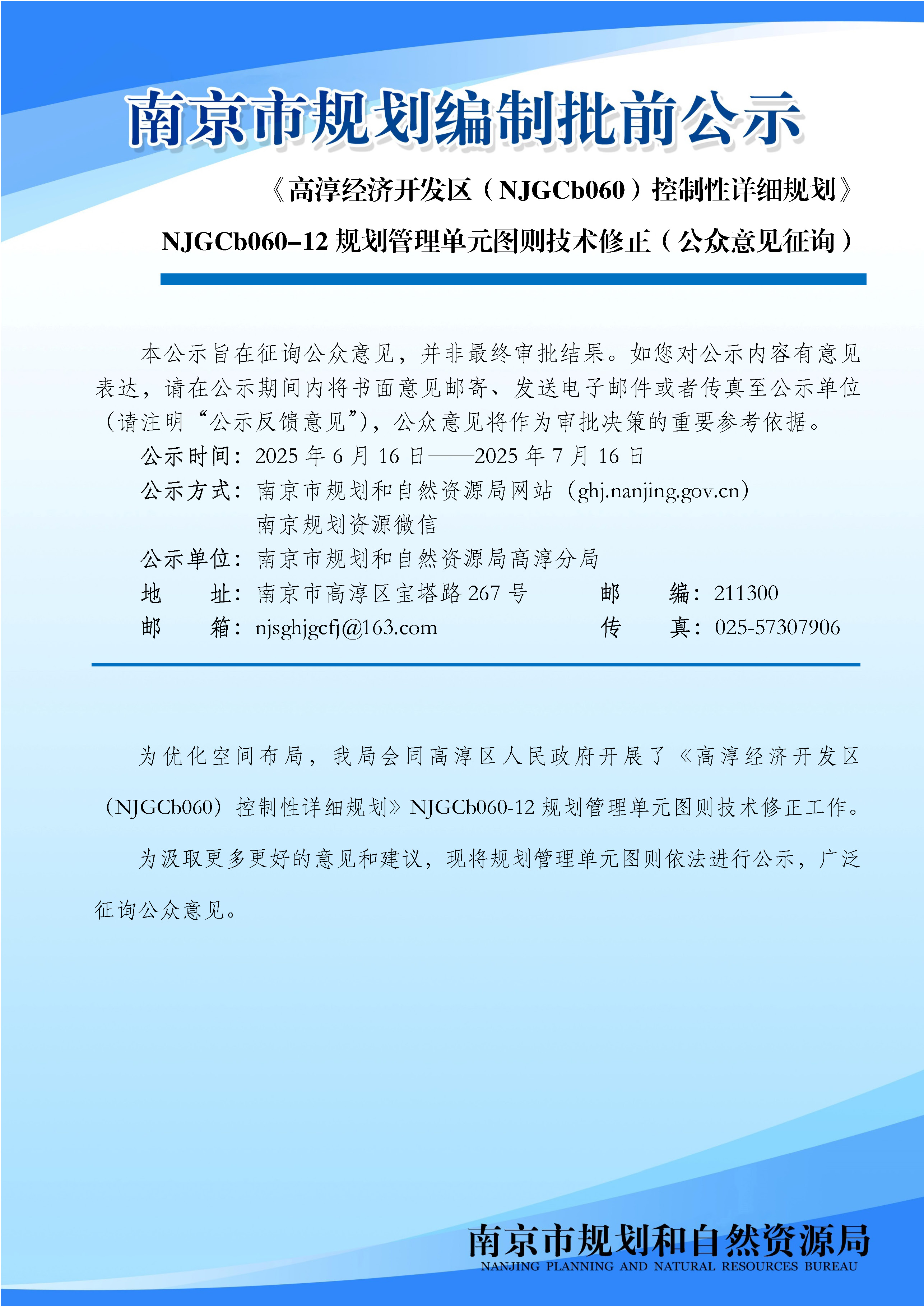 《高淳经济开发区控制性详细规划》NJGCb060-12规划管理单元图则修改(公众意见征询)