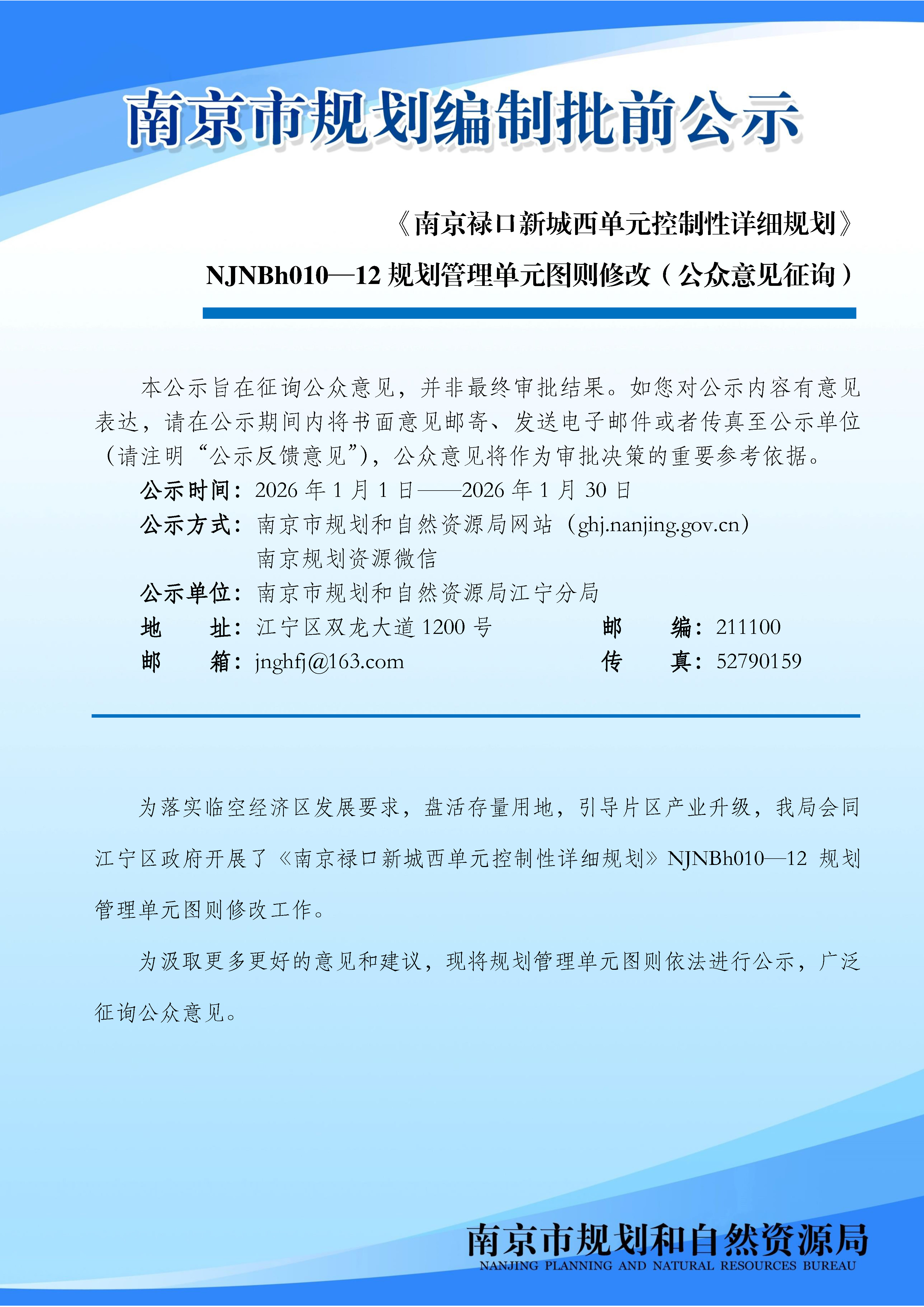 《南京禄口新城西单元控制性详细规划》NJNBh010-12规划管理单元图则修改(公众意见征询)